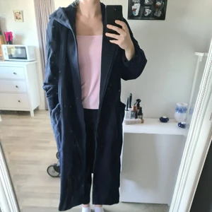 Underbar blå vintage kappa i ull och kashmir blandning. Detaljer i blått sammet vid ärmslut och luvan. Stängs med knappar. Två rymliga fickor framtill. Lätt vadderade axlar. Står emot kyla och vind. Kan hämtas i Täby C. Betalning sker genom swish.
