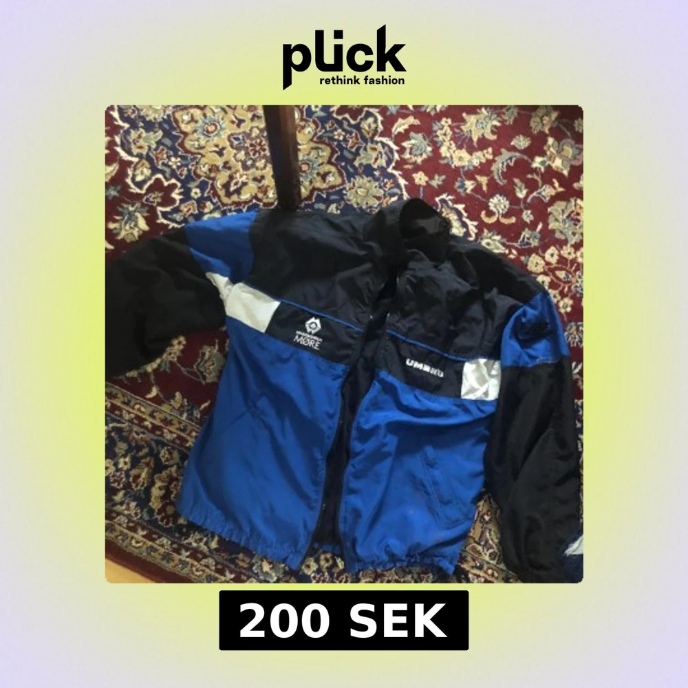 Säljer en blå och svart jacka från Umbro med dragkedja och vita detaljer. Jackan har långa ärmar och en sportig look, perfekt för höst och vår. Den har små fläckar över hela jackan se bilder