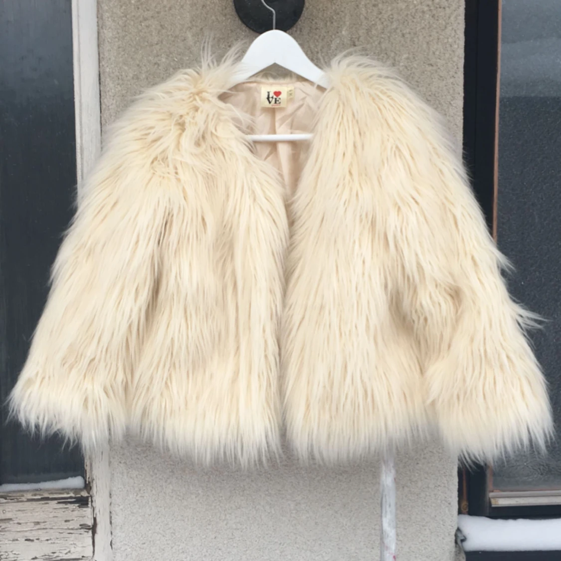 Lite kortare fuskpälsjacka/cardigan. Finns en knapp i kragen.
