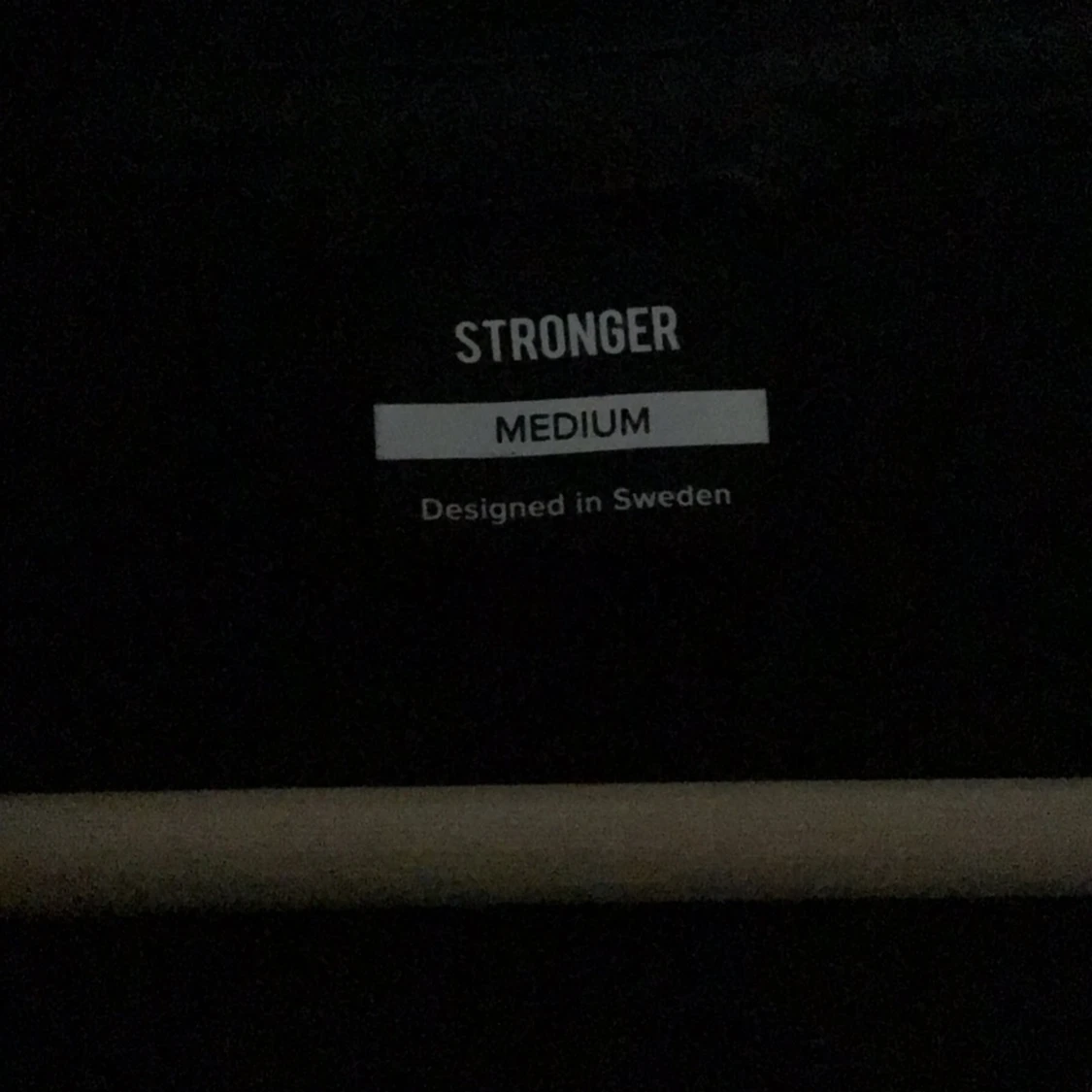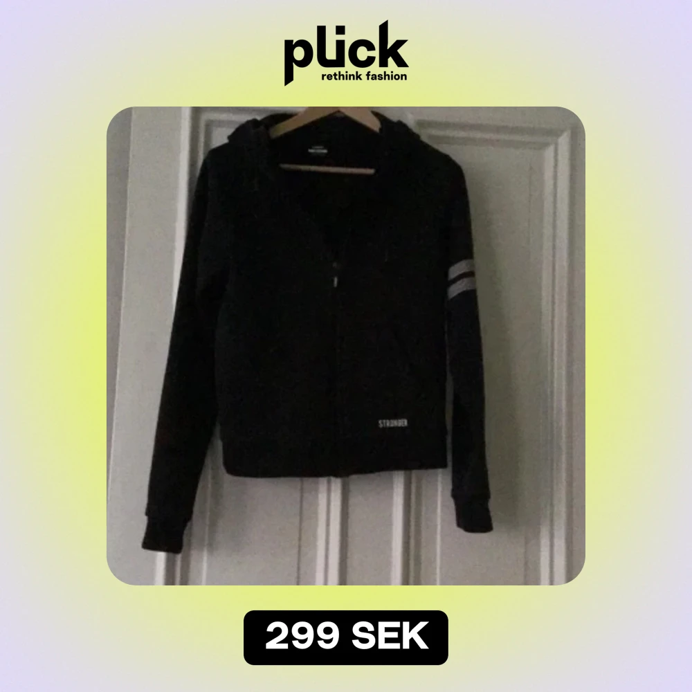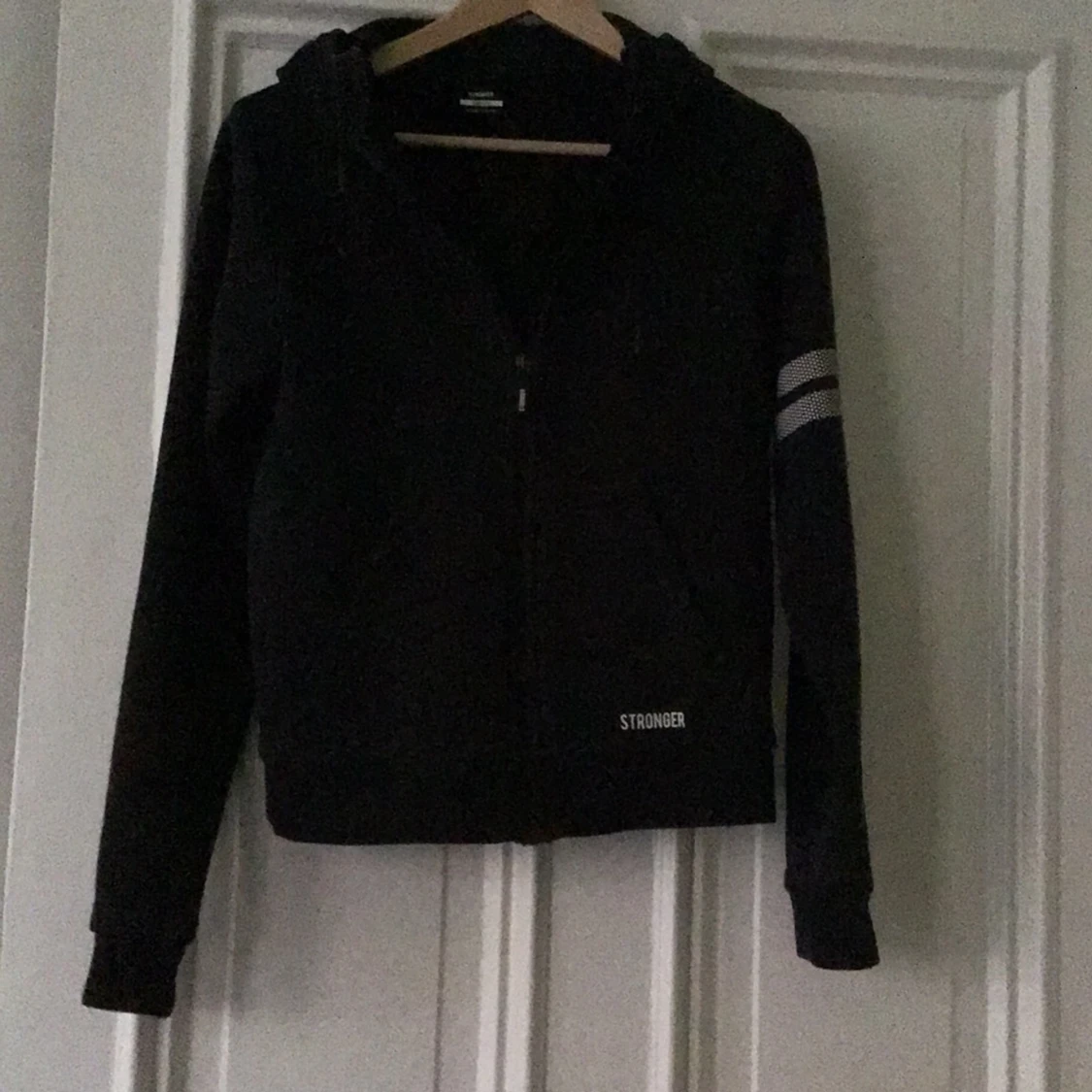 Säljer en svart jacka från Stronger i storlek medium. Den har en dragkedja framtill och en huva. På ärmen finns det två vita ränder som ger en sportig look. Perfekt för träning eller en avslappnad dag ute.