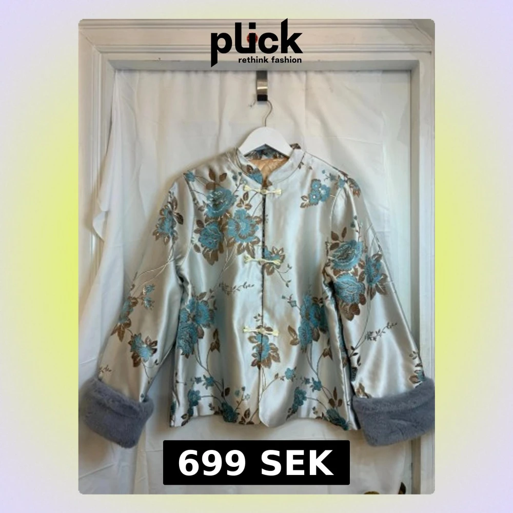 Elegant silk jacket with beautiful floral jacquard pattern and traditional Chinese knot buttons. Soft, slightly shiny surface with a luxurious feel. The sleeves feature delicate faux-fur cuffs, adding a unique and stylish touch. Easy to style for both everyday wear and special occasions – looks great with jeans or skirts. Size: 3XL (Chinese sizing, smallest size in this model is XL) Measurements: • Bust: 116 cm • Shoulder width: 41 cm • Length: 62 cm