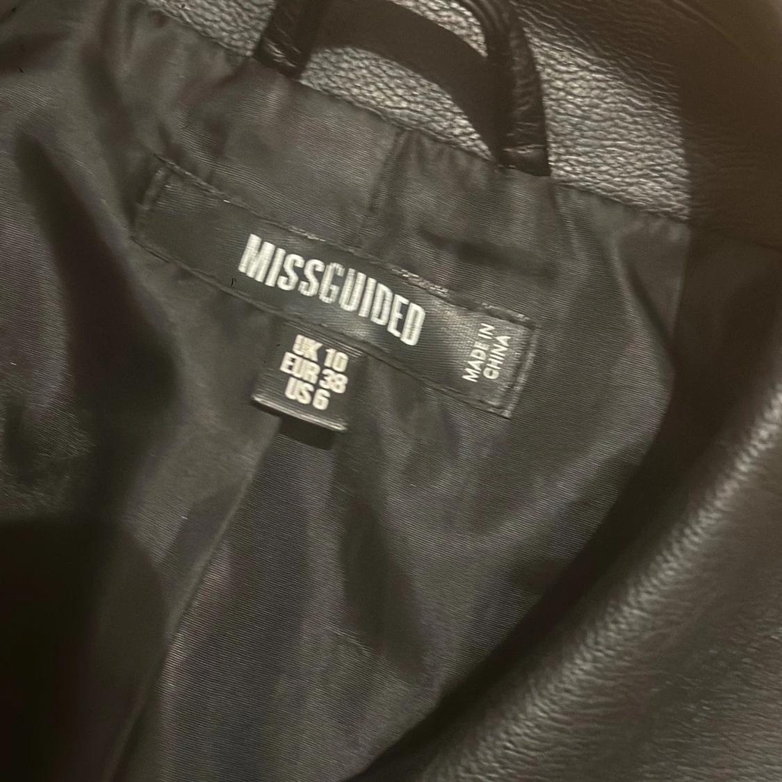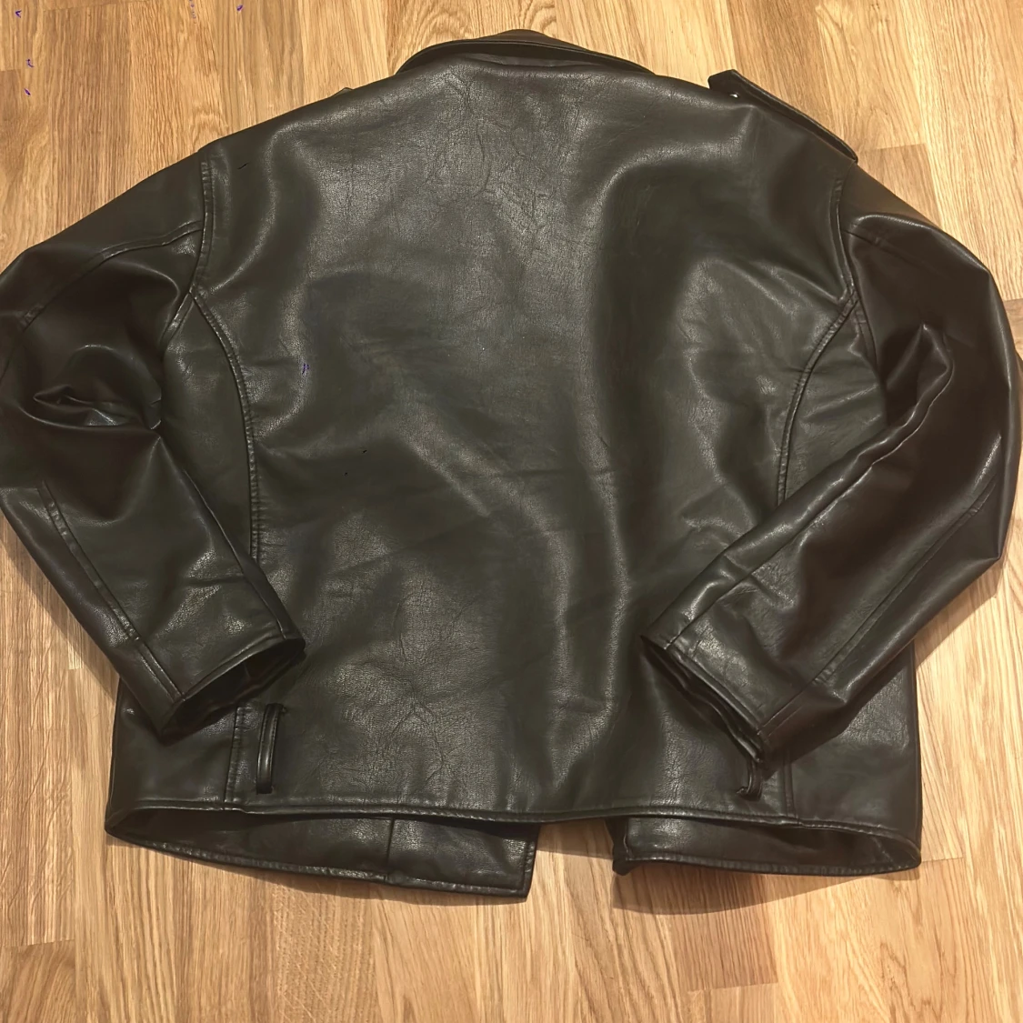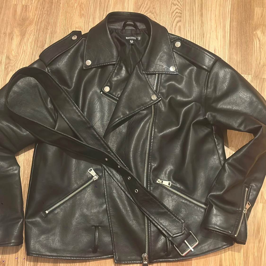 Säljer en svart skinnjacka från Missguided i klassisk bikerstil. Jackan har silvriga dragkedjor, axelklaffar och ett brett bälte i midjan. Snyggt snitt med långa ärmar och coola detaljer som ger en edgy vibe.