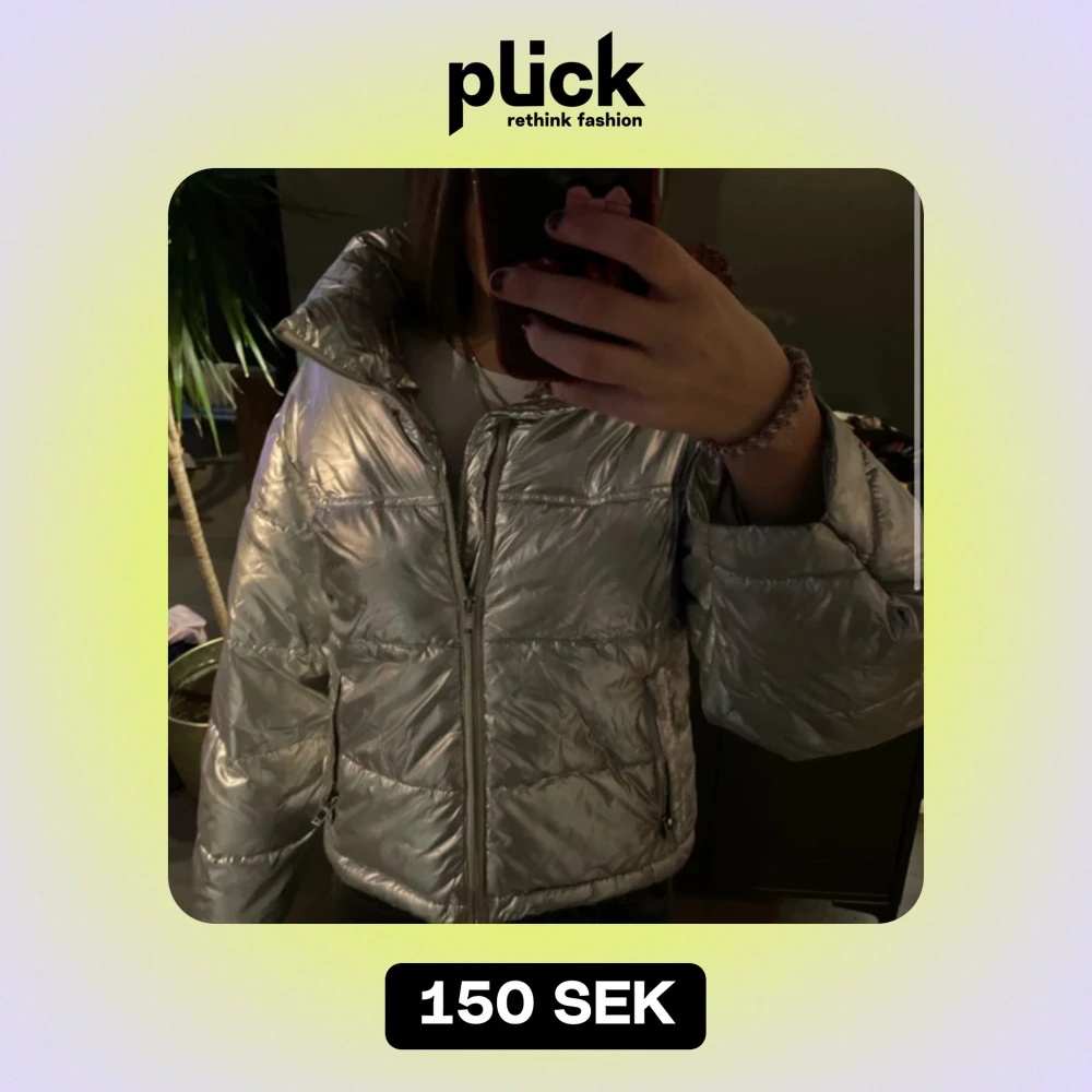 Säljer en supercool silverfärgad pufferjacka som verkligen sticker ut! Den har en dragkedja framtill och är perfekt för kalla dagar. Jackan är långärmad och har en glansig finish som ger en futuristisk look. Perfekt för vintern och hösten när du vill hålla dig varm och snygg.