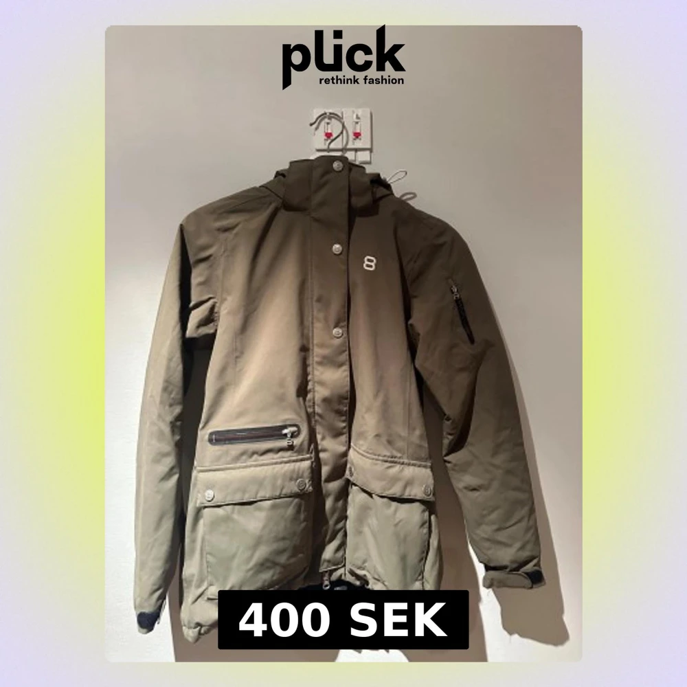 Olivgrön skidjacka från 8848 Altitude med huva, flera fickor med dragkedja och knappar med logga