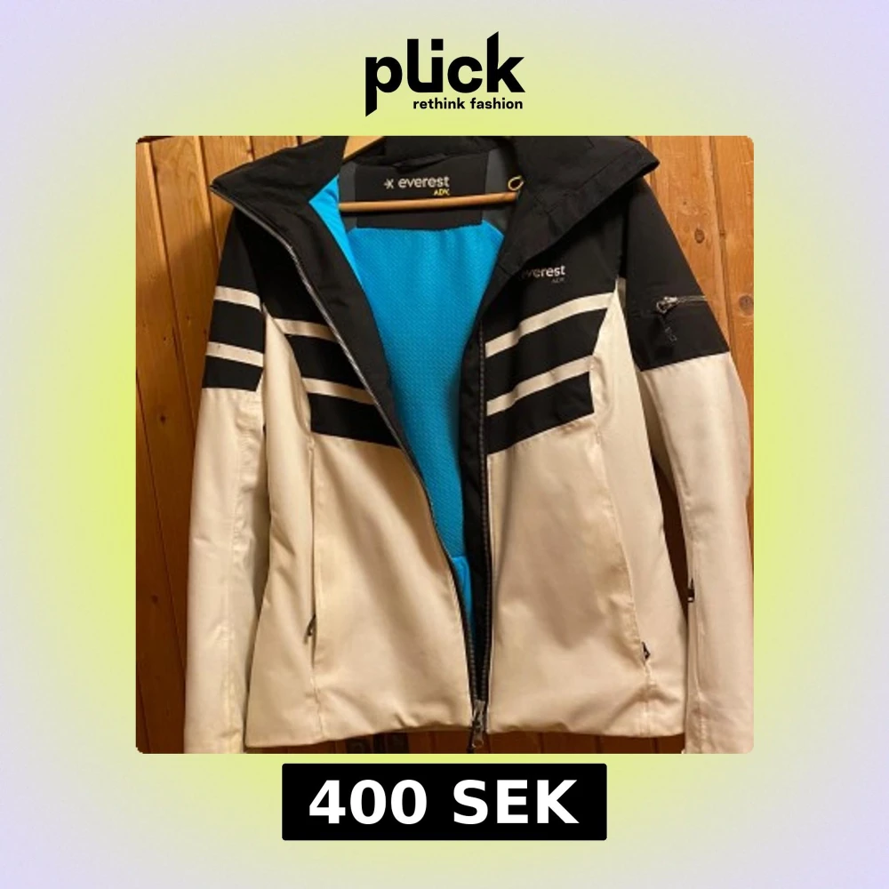 Snygg vit och svart jacka från Everest med dragkedja och huva. Jackan har svarta detaljer och ett blått innerfoder. Perfekt för kyligare väder. Strl 36. Köpt på stadium för 1799kr.