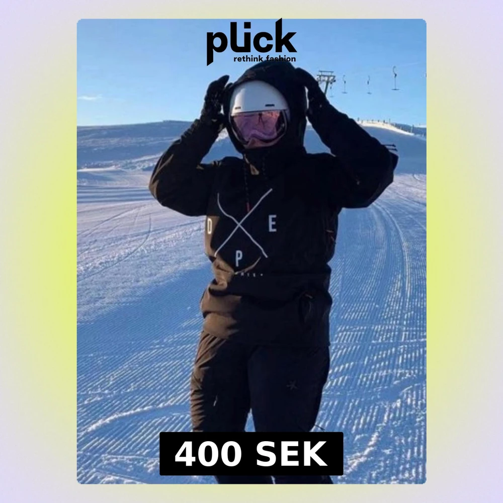 Svart skidjacka från Dope med stor vit logga på bröstet, huva med snörning och röda detaljer. Jackan har lång ärm, dragkedja på ärmen och mjukt fleecefoder på insidan. Perfekt för vinter och skidåkning, riktigt snygg och funktionell.