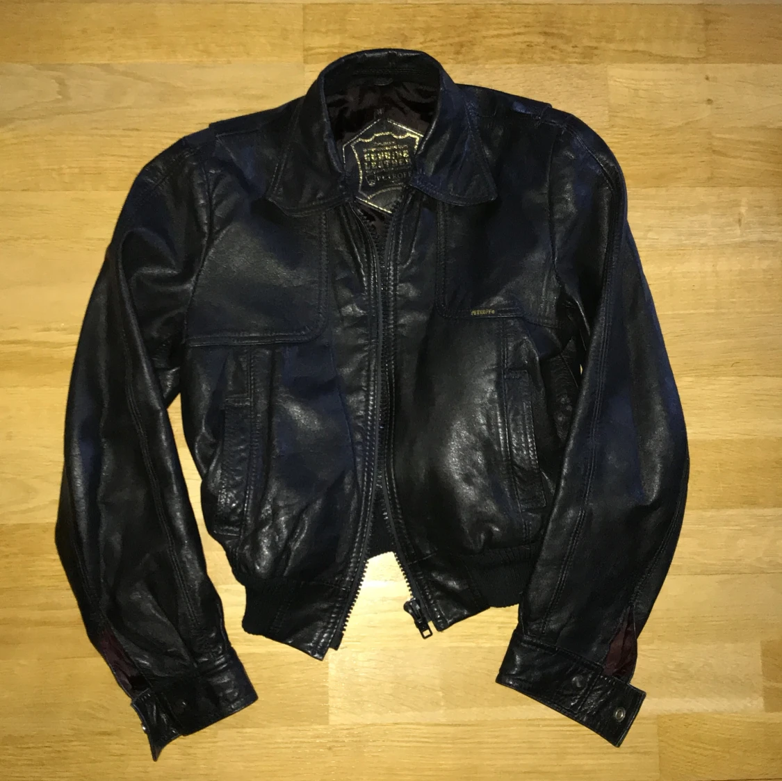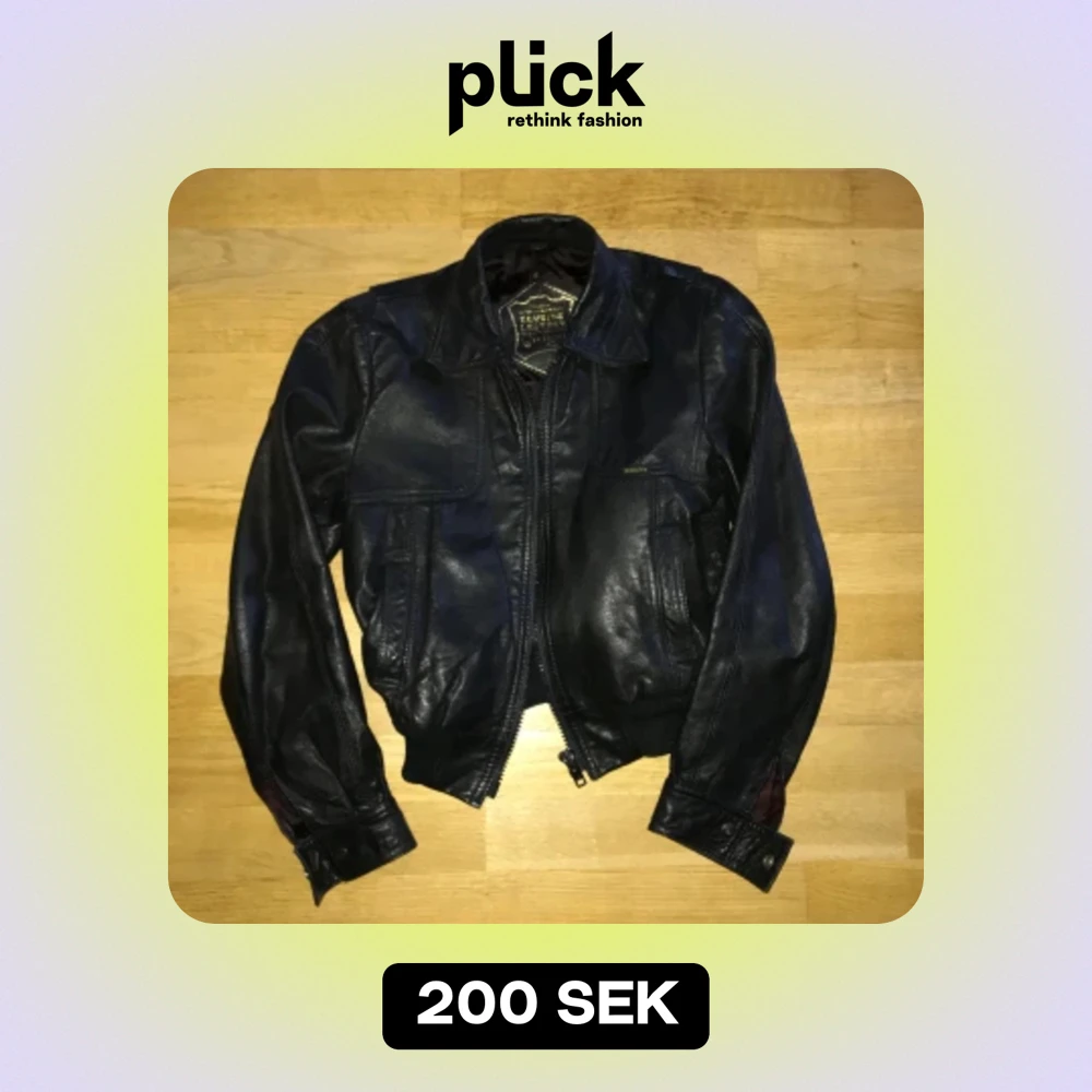 Vintage skinnjacka i nyskick (äkta skinn), lite kortare och går ungefär till höften💕 50cm från axeln till botten 40cm på bredden 🙏