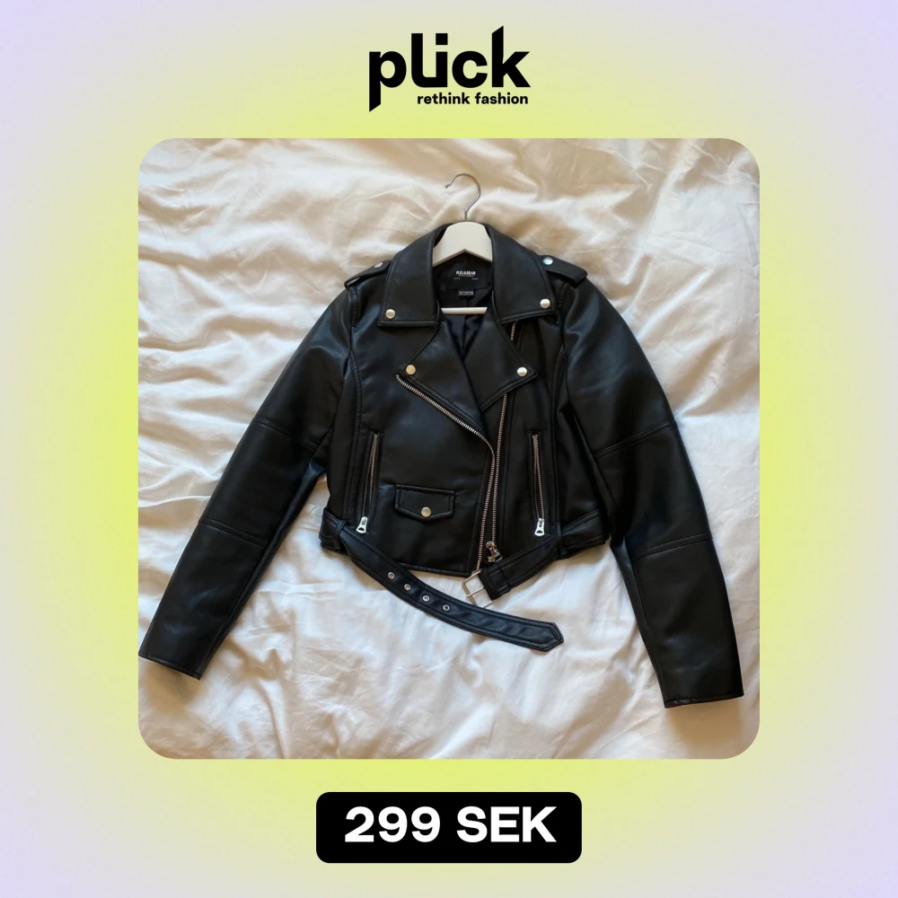 Jacka i konstläder från Pull & Bear i storlek M, men är liten i storlek så funkar som S! Köpt för 400kr. Använd 1 gång.