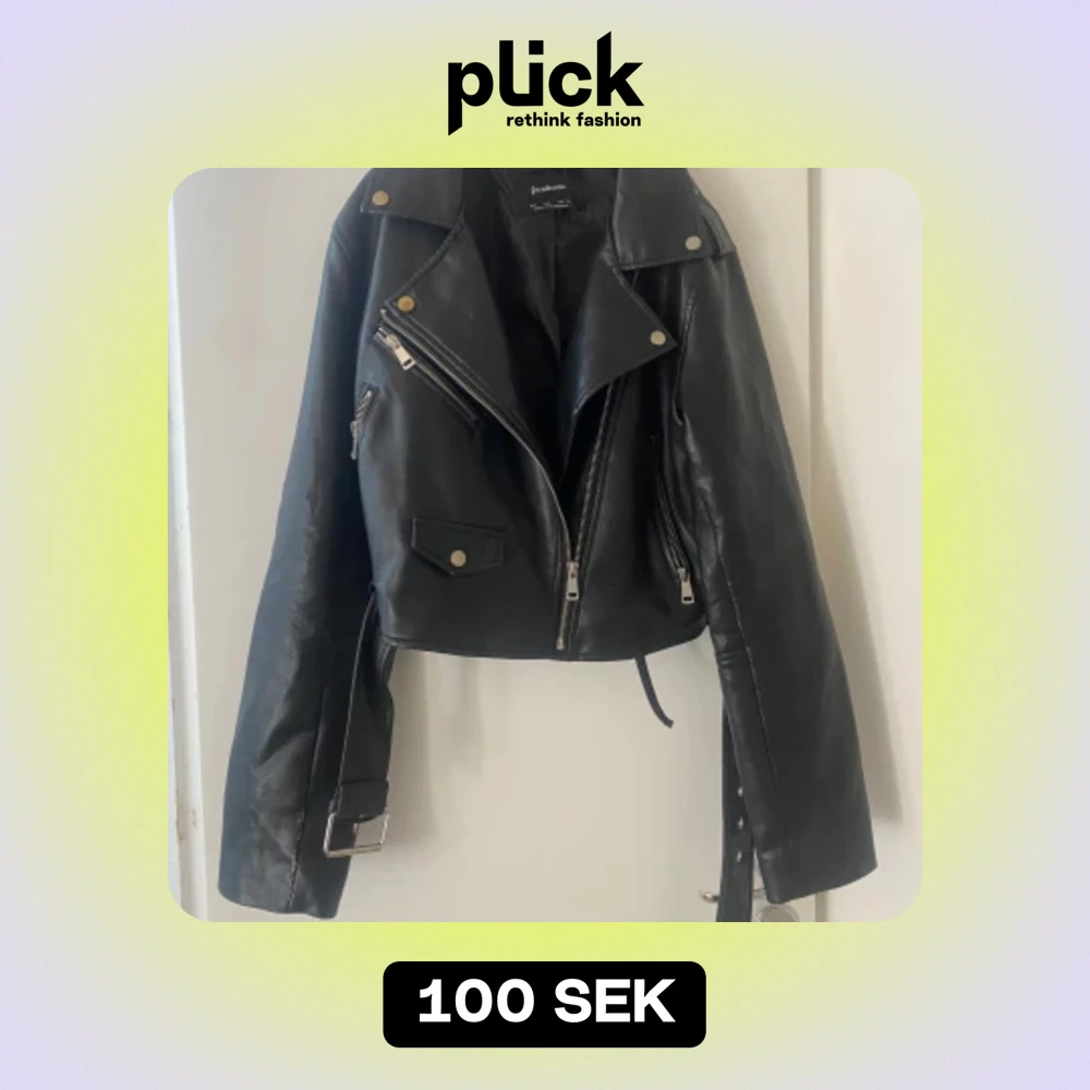 Svart skinnjacka, väldigt snygg. Tyvärr så som ni ser har den gått sönder där nere(den som hänger ner vet inte vad den heter) går att fixa antingen klippa bort den eller limma fast den🫶🏼
