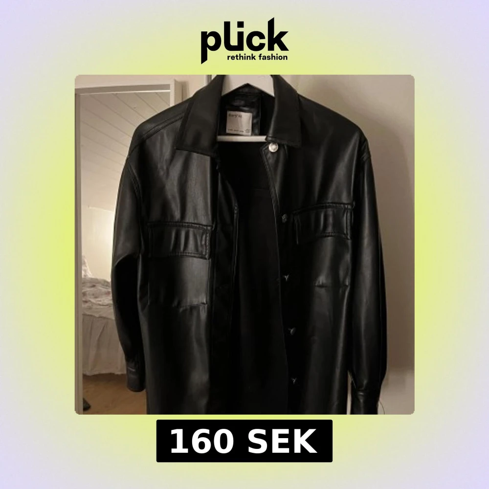 Snygg svart skinnjacka från Bershka med knappar framtill. Jackan har en klassisk krage och långa ärmar. Perfekt för en stilren look.