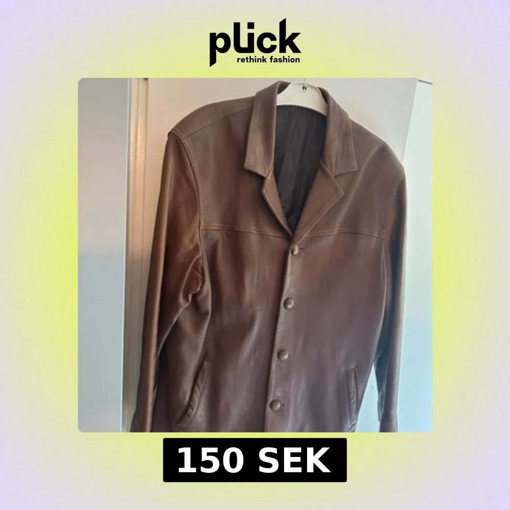 Snygg brun skinnjacka med klassisk krage och knäppning framtill. Jackan har två fickor på sidorna och är helfärgad utan mönster. Insidan är fodrad och jackan har en rak passform som funkar till många stilar. Observera hålet på insidan (inget som är synligt när man har på sig jackan).