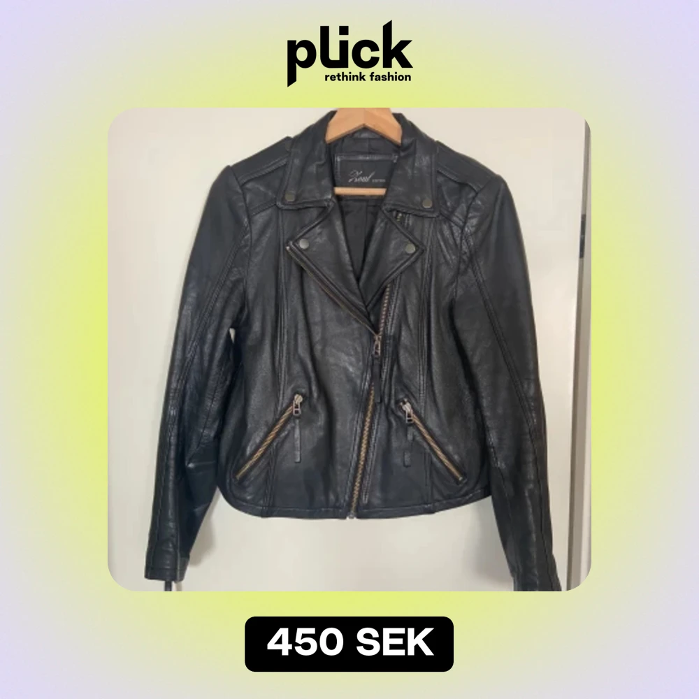Skinnjacka i bikermodell. Har ett litet märke på ryggen, se bild☺️ Fodret i ena fickan är trasigt men fickan går att använda ändå, alternativt kan man sy.