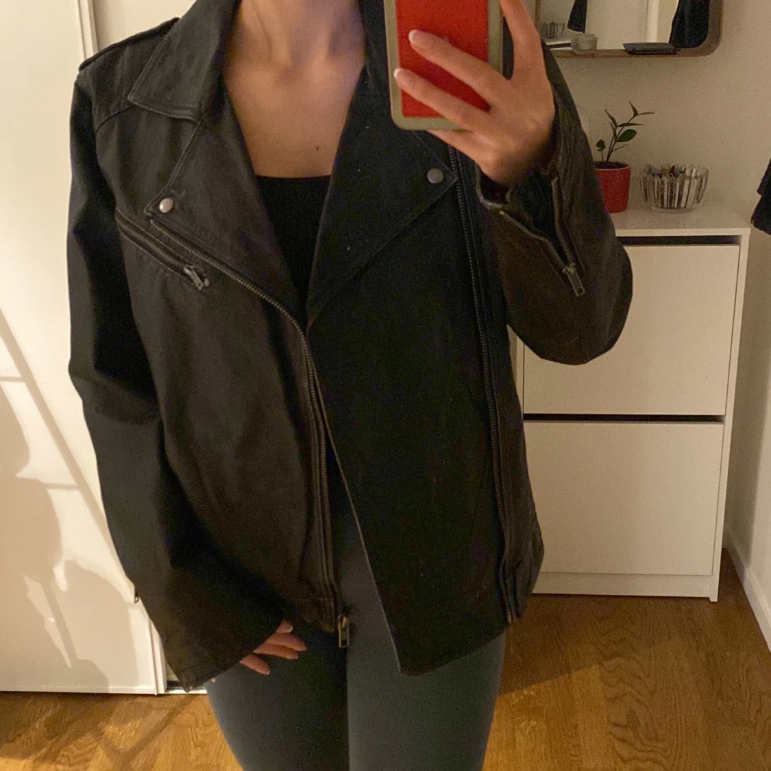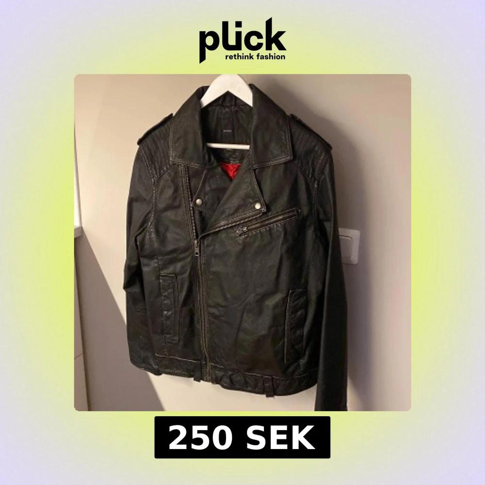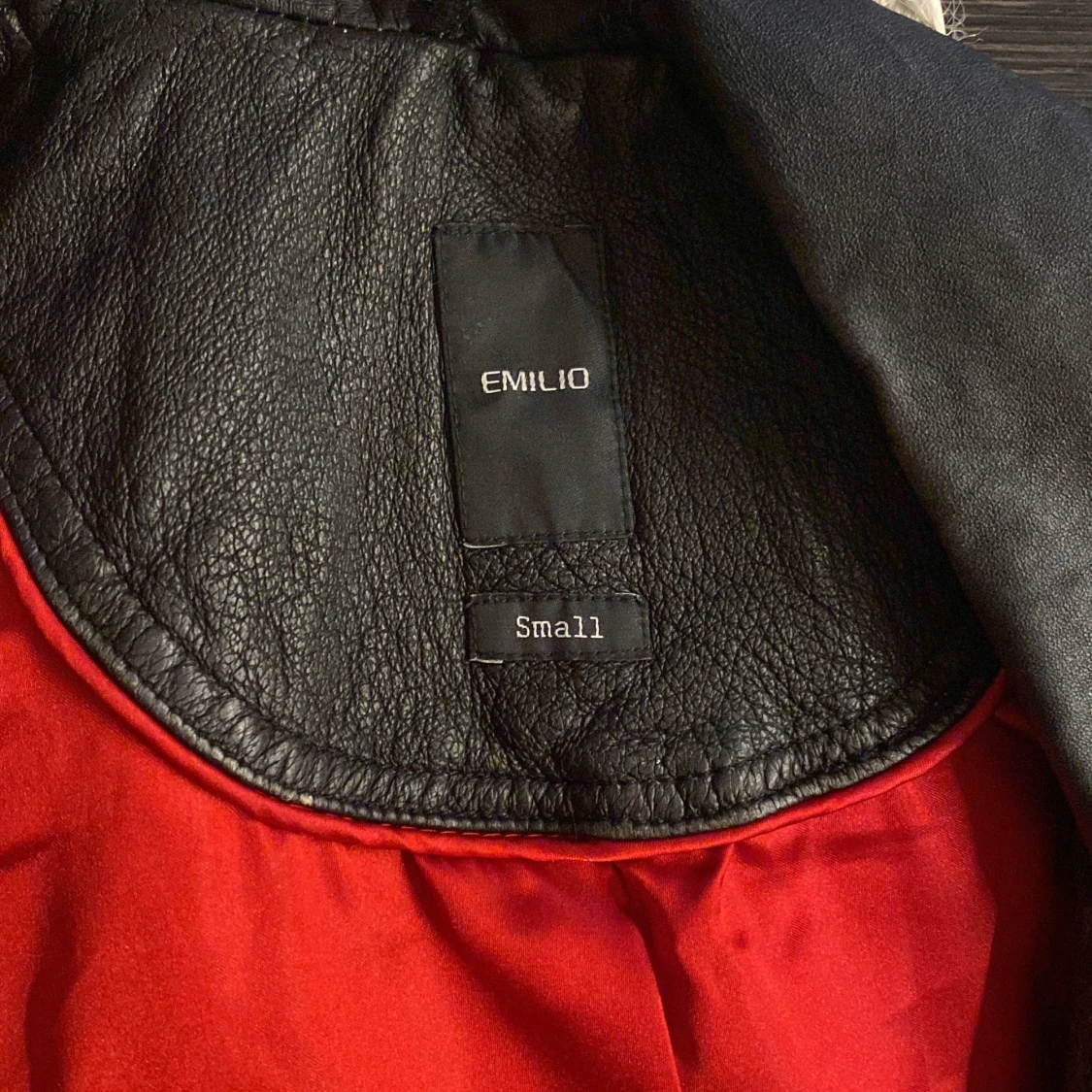 Säljer en svart skinnjacka från Emilio i storlek S. Jackan har klassisk bikerstil med sned dragkedja, axelklaffar och coola detaljer som fickor med dragkedja. Röd insida som ger extra edge.