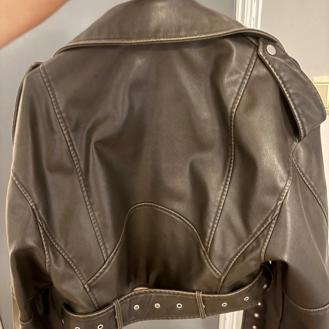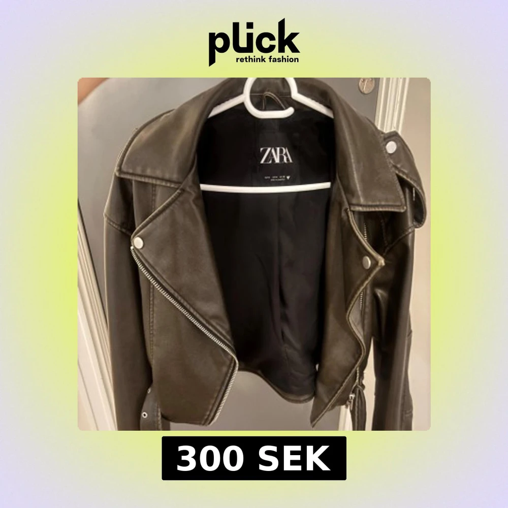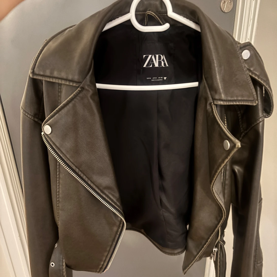 Snygg svart skinnjacka från Zara med klassisk bikerstil. Jackan har silvriga dragkedjor, breda slag och bälte i midjan. Croppad modell som ger en cool vibe och passar perfekt till jeans eller klänning. Fodrad insida och detaljerade sömmar för extra edge.