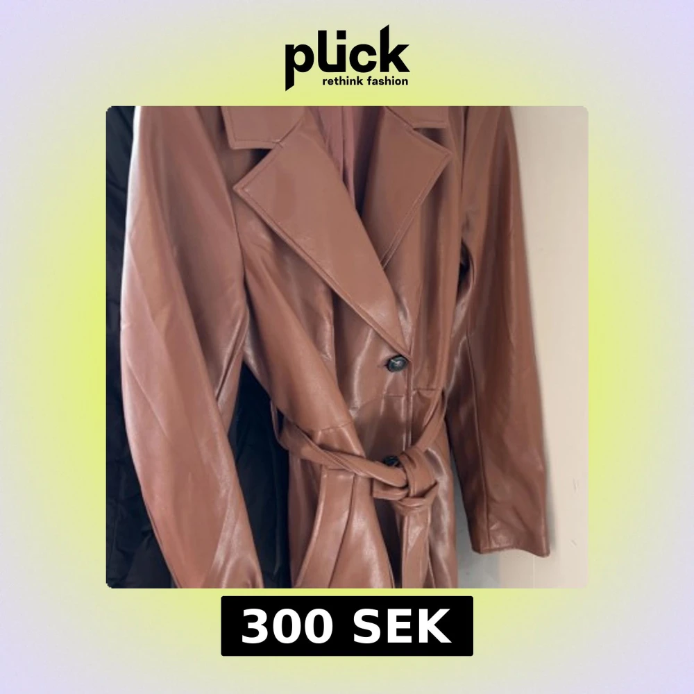 Snygg brun trenchcoat i skinnimitation med breda slag, knappar framtill och matchande bälte i midjan. Jackan har en klassisk, rak passform och långa ärmar. Perfekt för dig som vill ha en trendig och stilren look.