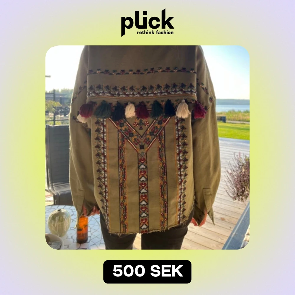 Snyggaste jackan jag vet!! Det är en jeansjacka som är grön, jackan har massor med detaljer som är i olika färger som tillexempel vinrött som är perfekt till hösten!! Jackan har inga dekaler🩷
