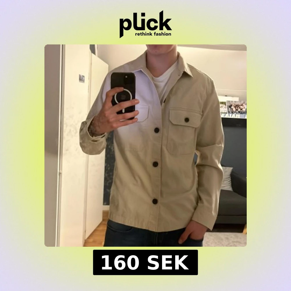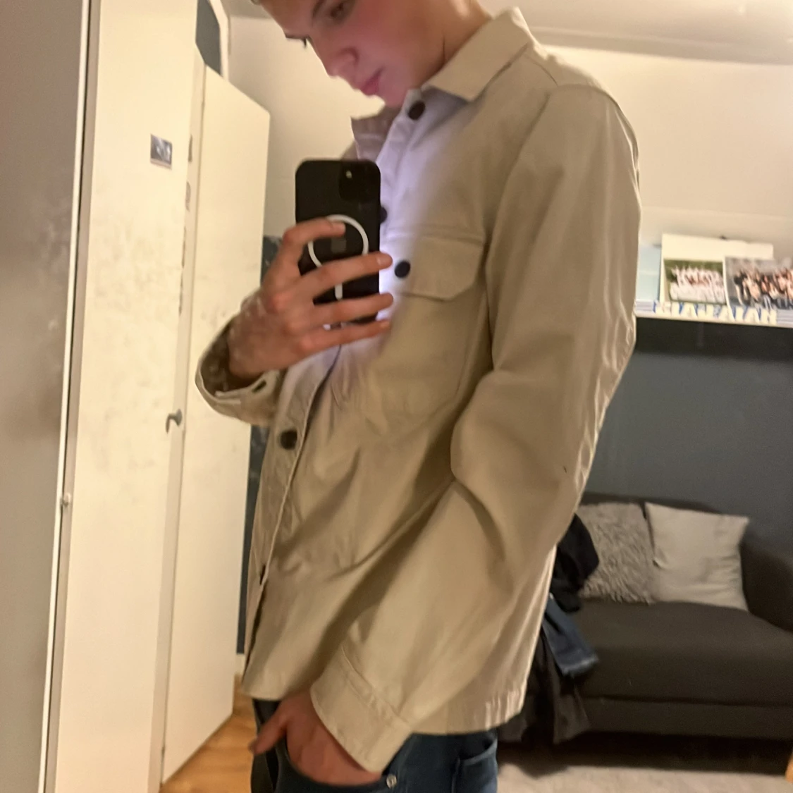 Säljer en stilren beige overshirt från H&M med knappar framtill och två bröstfickor. Perfekt för lager-på-lager-stil och passar till många olika outfits.