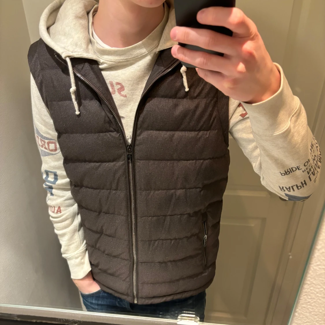 En grå väst från märket Montegro i typ mocka liknande material. Mörkgrå storlek M. Västen har sköna detaljer både på insidan och utsidan, två innerfickor och coolt mönster på insidan! Hör av dig vid frågor🤝
