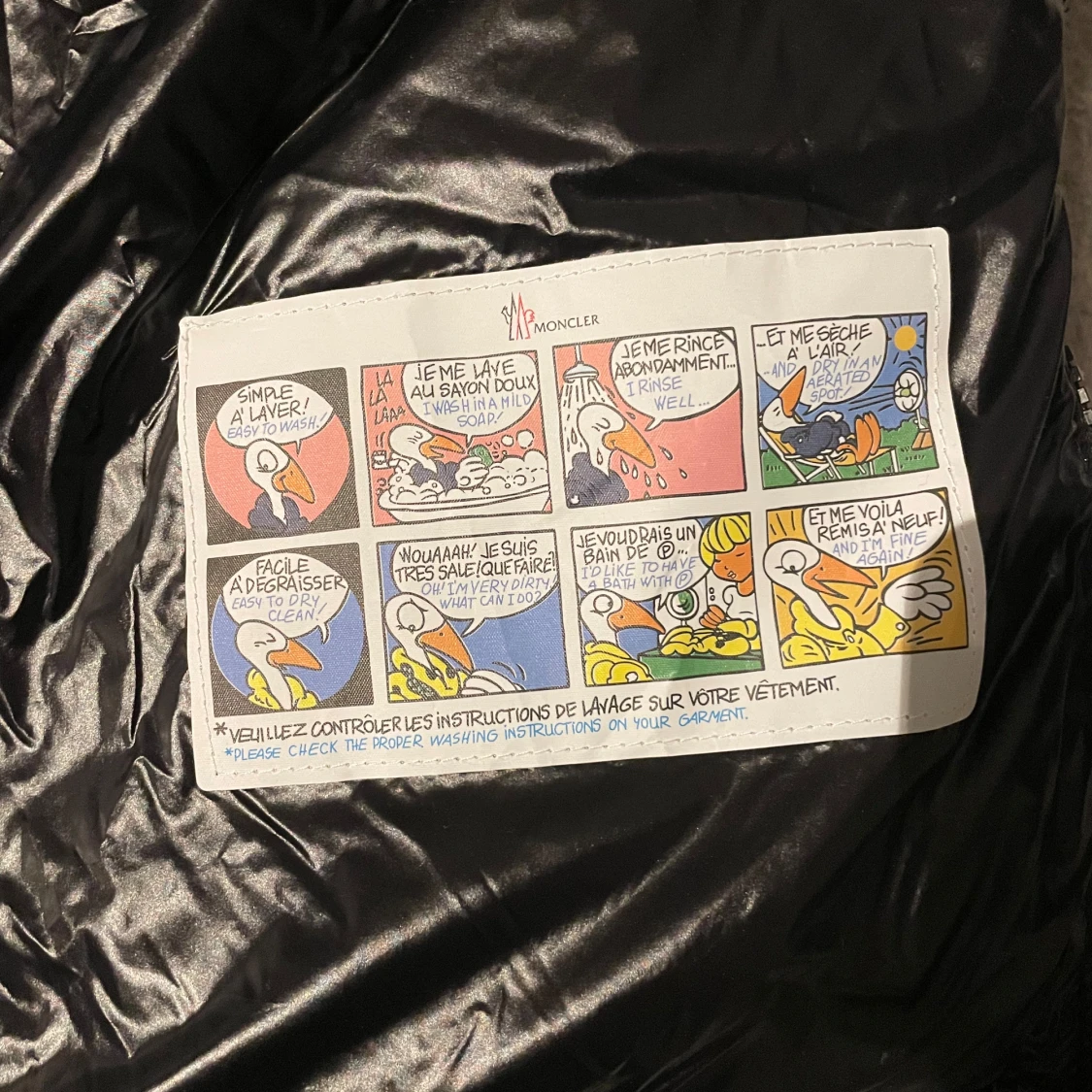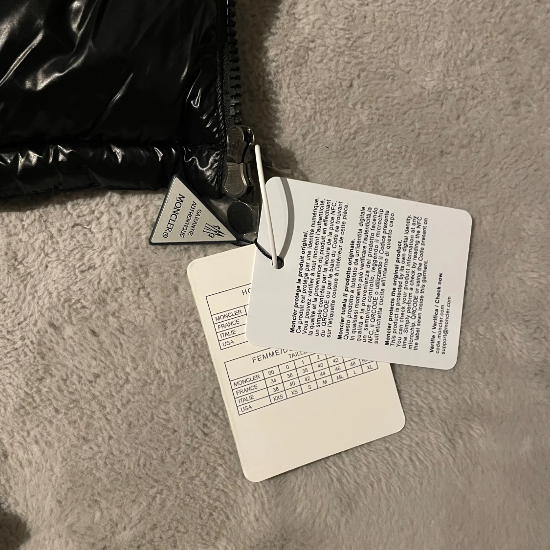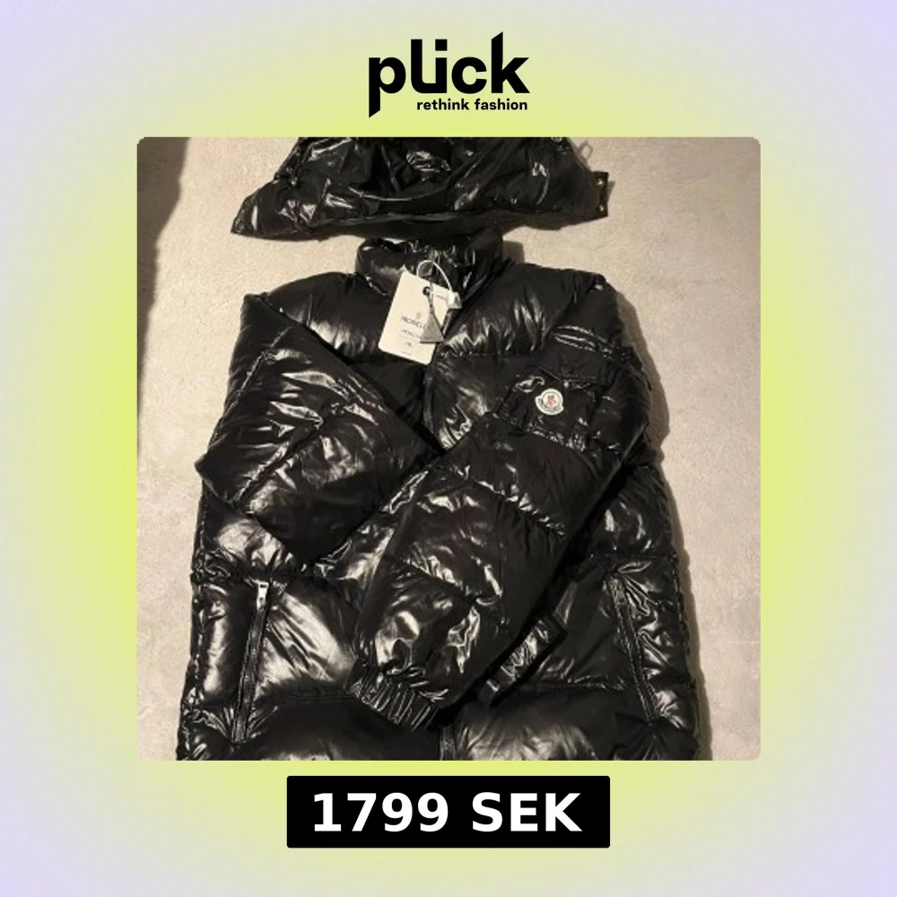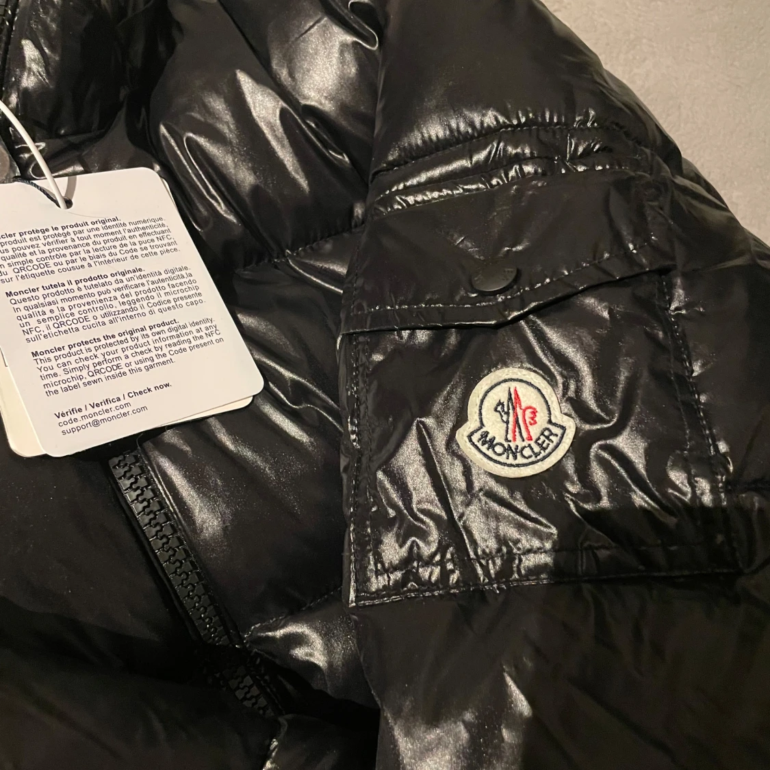 Snygg svart pufferjacka från Moncler med avtagbar huva och dragkedja. Jackan har ett stilrent märke på ärmen och är perfekt för kalla dagar.