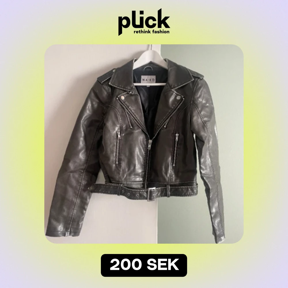 Fejk-skinnjacka från Na-kd i storlek L. I gott skick, har en mörk grå ton med slitningar.