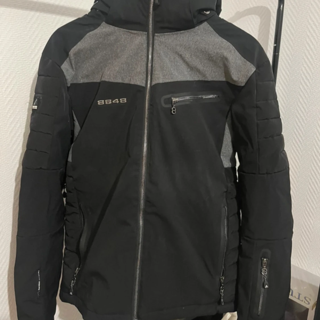 Säljer en snygg svart och grå jacka från 8848 Altitude. Jackan har en dragkedja framtill och flera praktiska fickor med dragkedjor. Perfekt för kyligare dagar med sin stilrena design och funktionella detaljer.