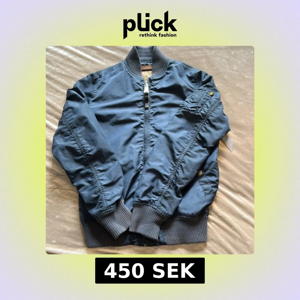 Säljer en klassisk blå bomberjacka från Alpha Industries med orange foder. Jackan har ribbade muddar, dragkedja framtill och en ikonisk ficka med dragkedja på ärmen. Tillverkad i slitstark polyester och har en snygg, tidlös look.