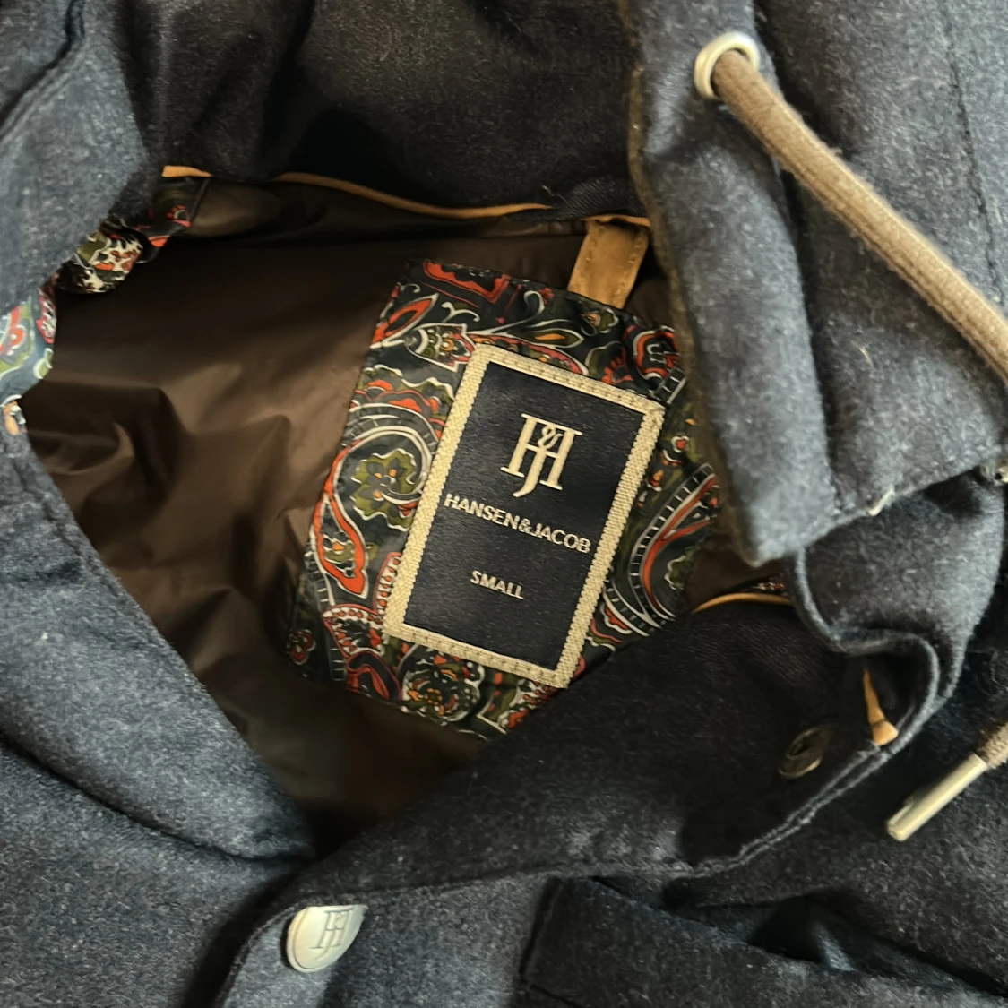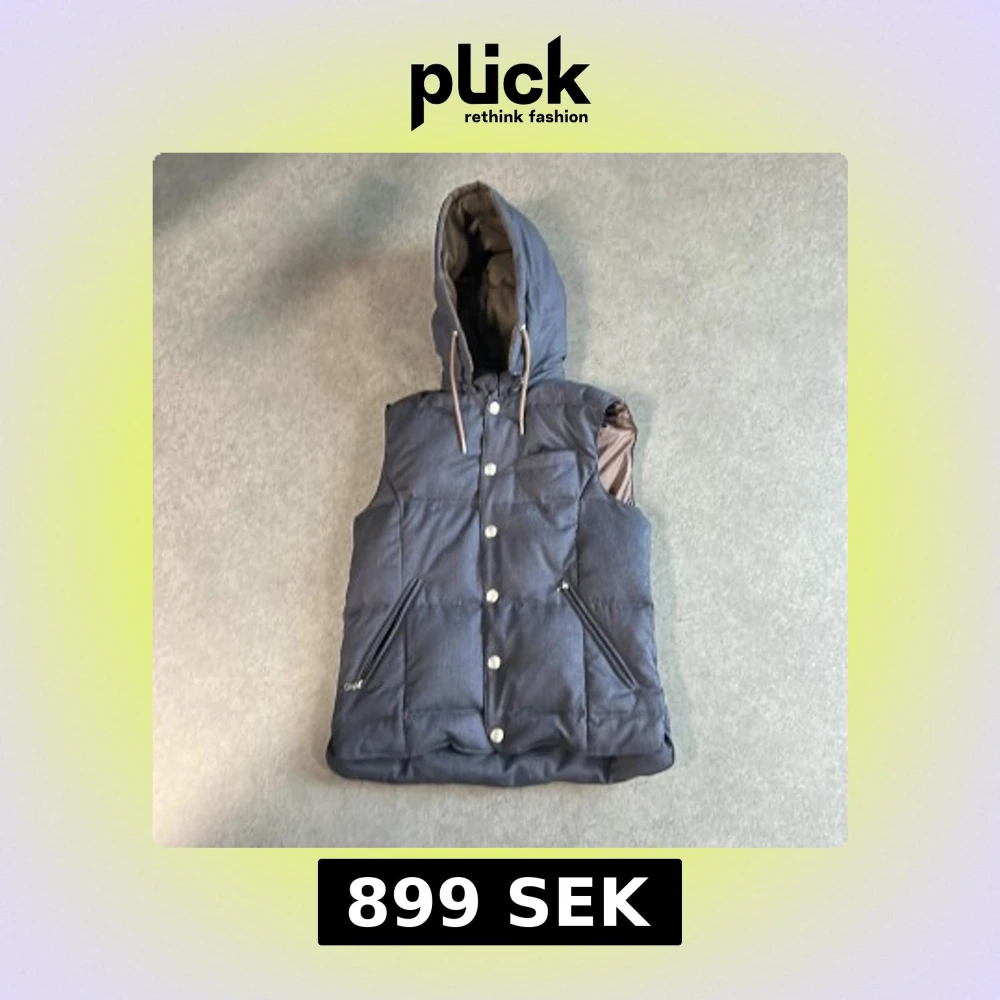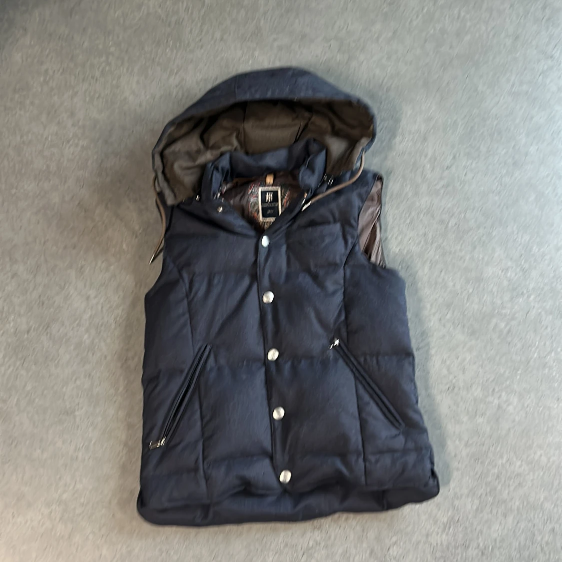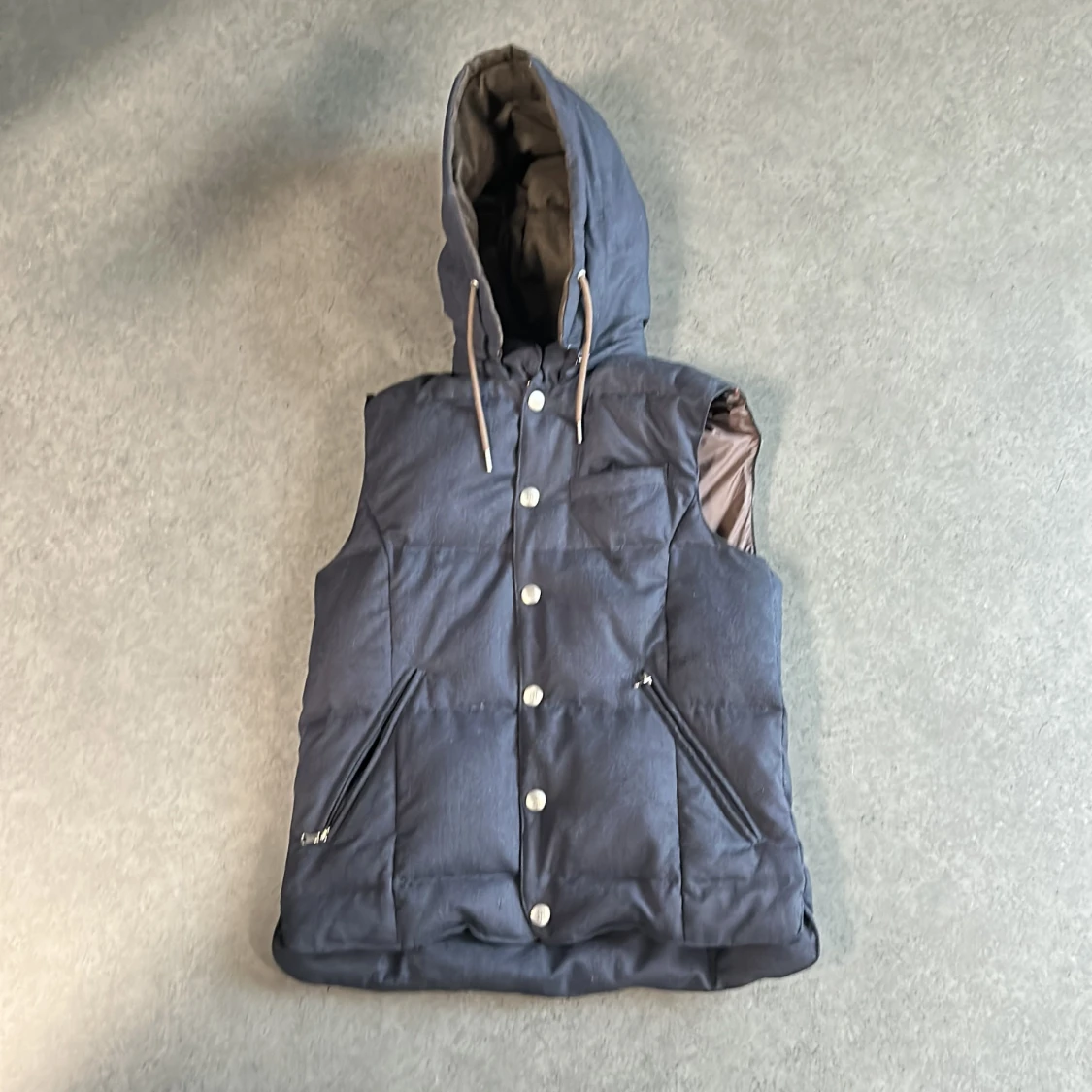 Snygg mörkblå dunväst från Hansen & Jacob med huva och dragsko. Västen har knappar framtill, två dragkedjefickor och ett coolt paisleymönstrat innerfoder. Perfekt för lager-på-lager och chillare dagar.
