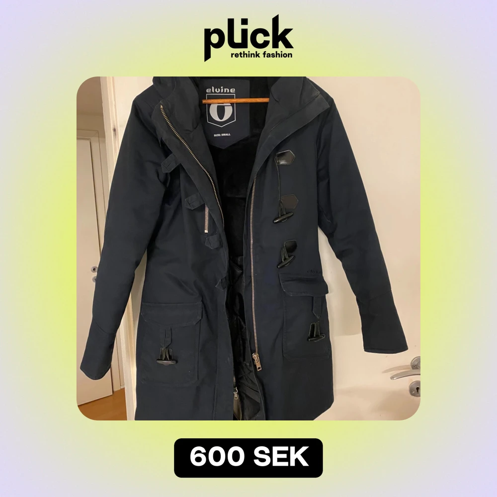 Säljer en snygg svart parkajacka från Elvine i storlek small. Jackan har en dragkedja och knappar framtill, samt flera praktiska fickor. Den är quiltad inuti för extra värme och har en huva för att skydda mot väder och vind. Perfekt för höst och vinter!
