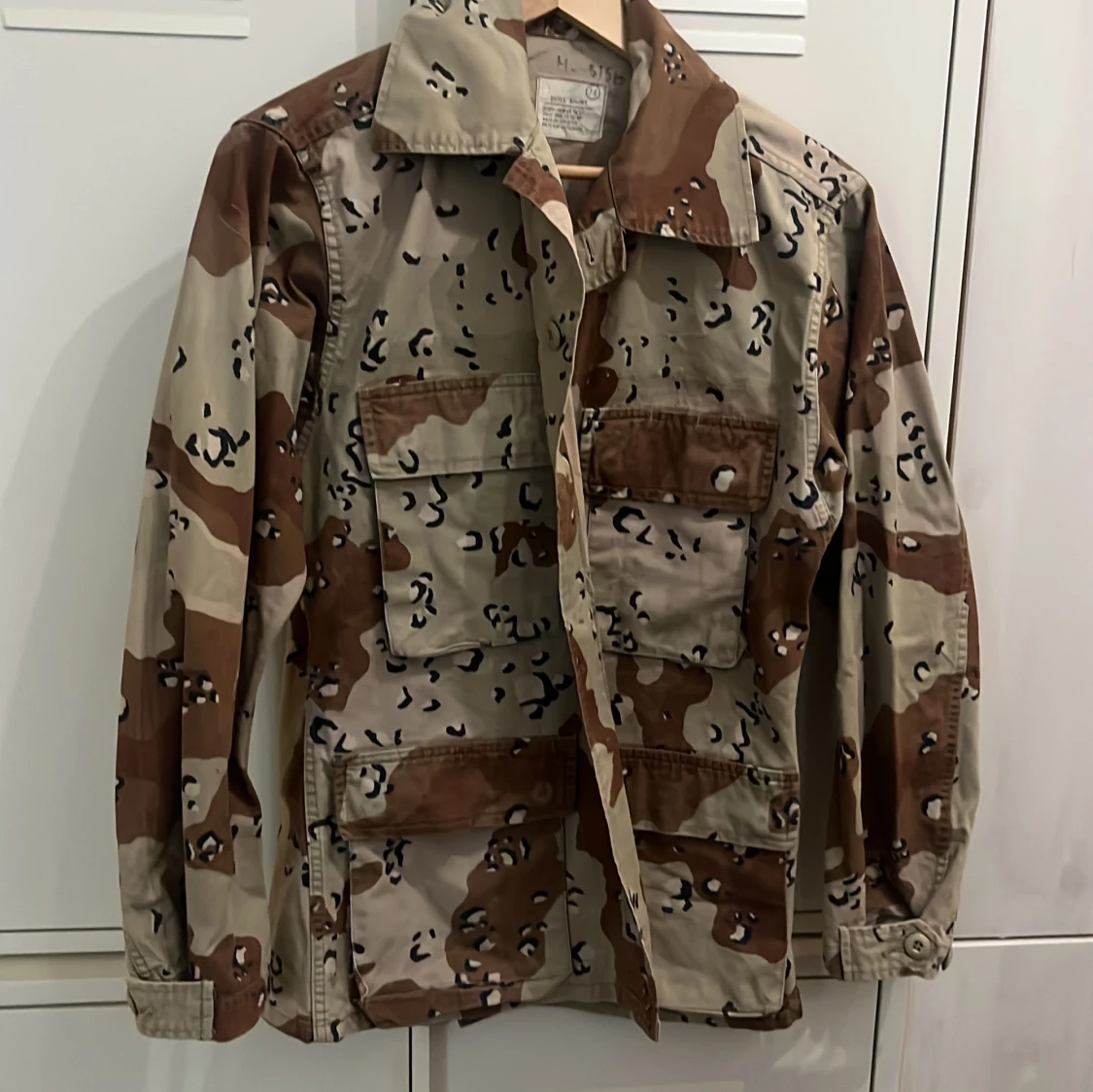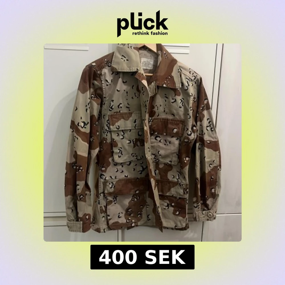 Säljer en oversized desert camo overshirt med stora fickor framtill och klassisk krage. Jackan är i beige och bruna toner med svart camouflagemönster. Materialet är en mix av bomull och nylon, perfekt för dig som gillar militärinspirerad streetstyle.