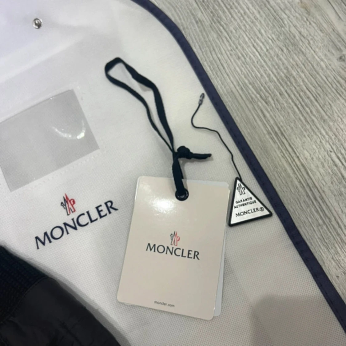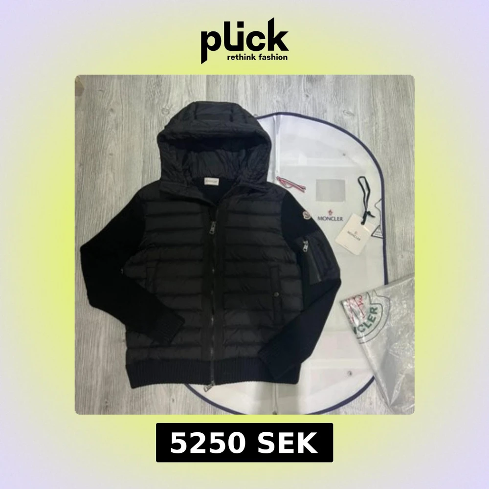 Svart cardigan jacka från Moncler med dunfylld kropp och stickade ärmar. Jackan har huva, dragkedja framtill och Moncler-logga på ärmen. Perfekt för dig som vill ha en snygg och sportig look med exklusiv känsla.
