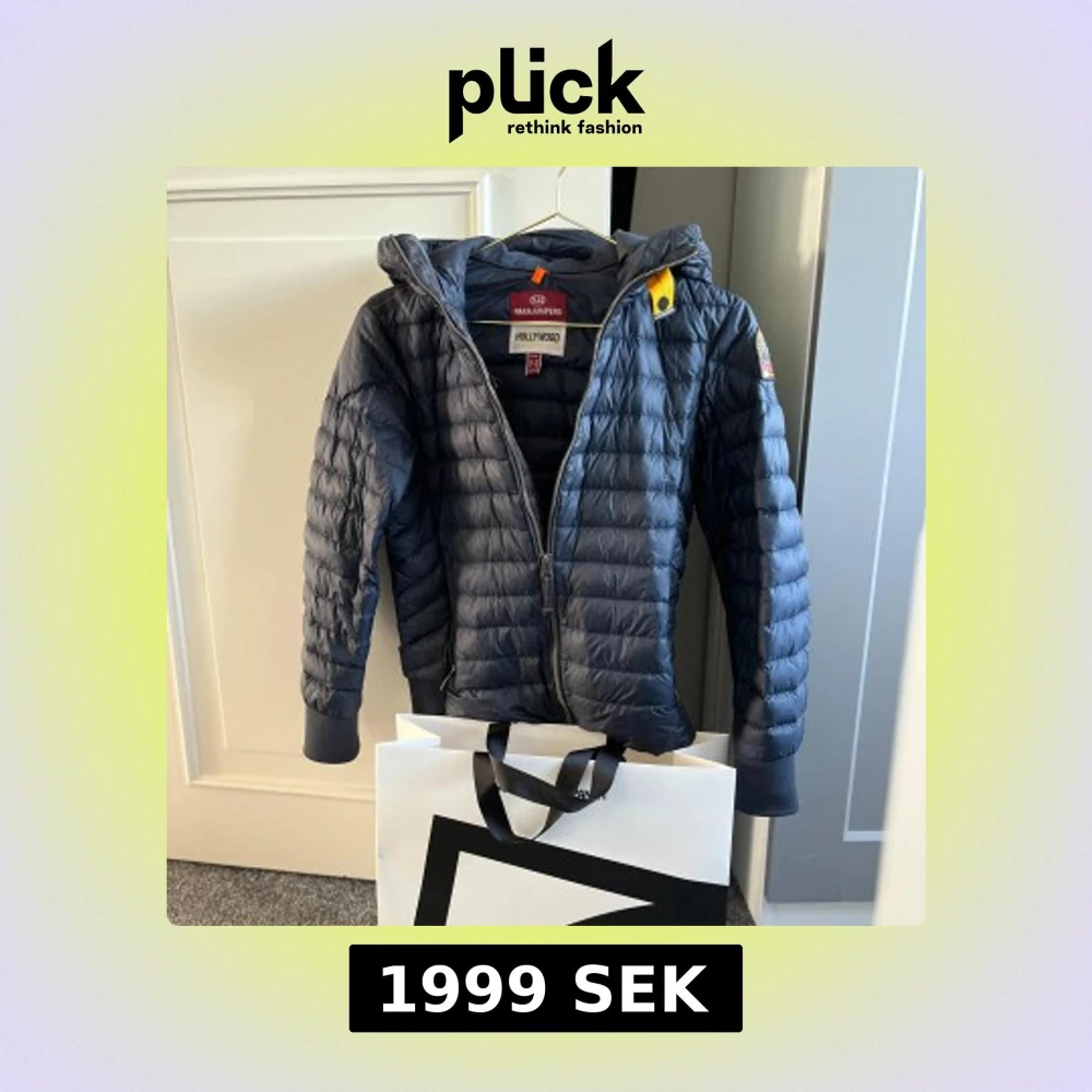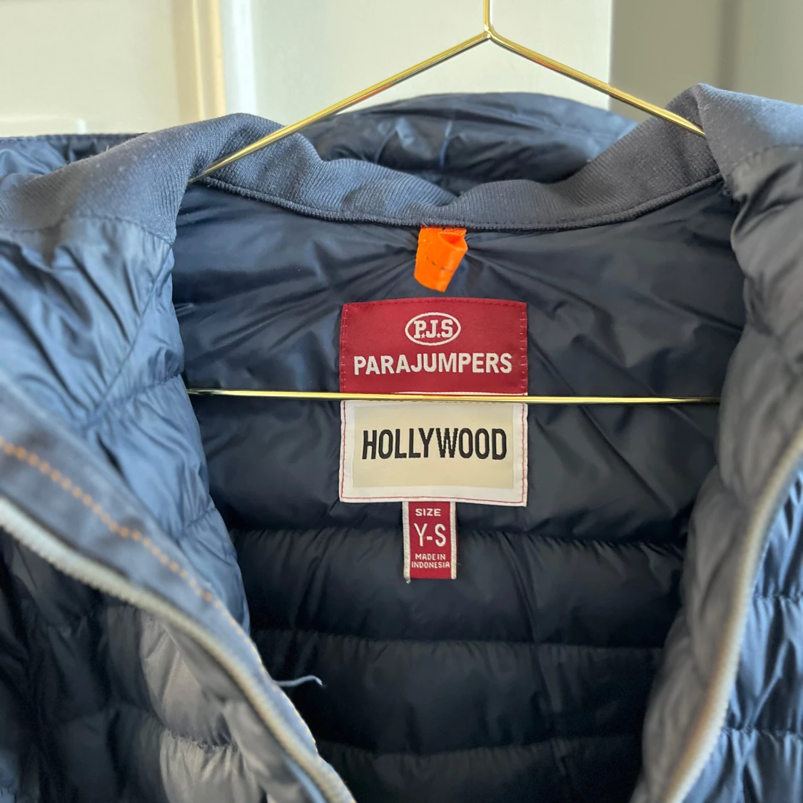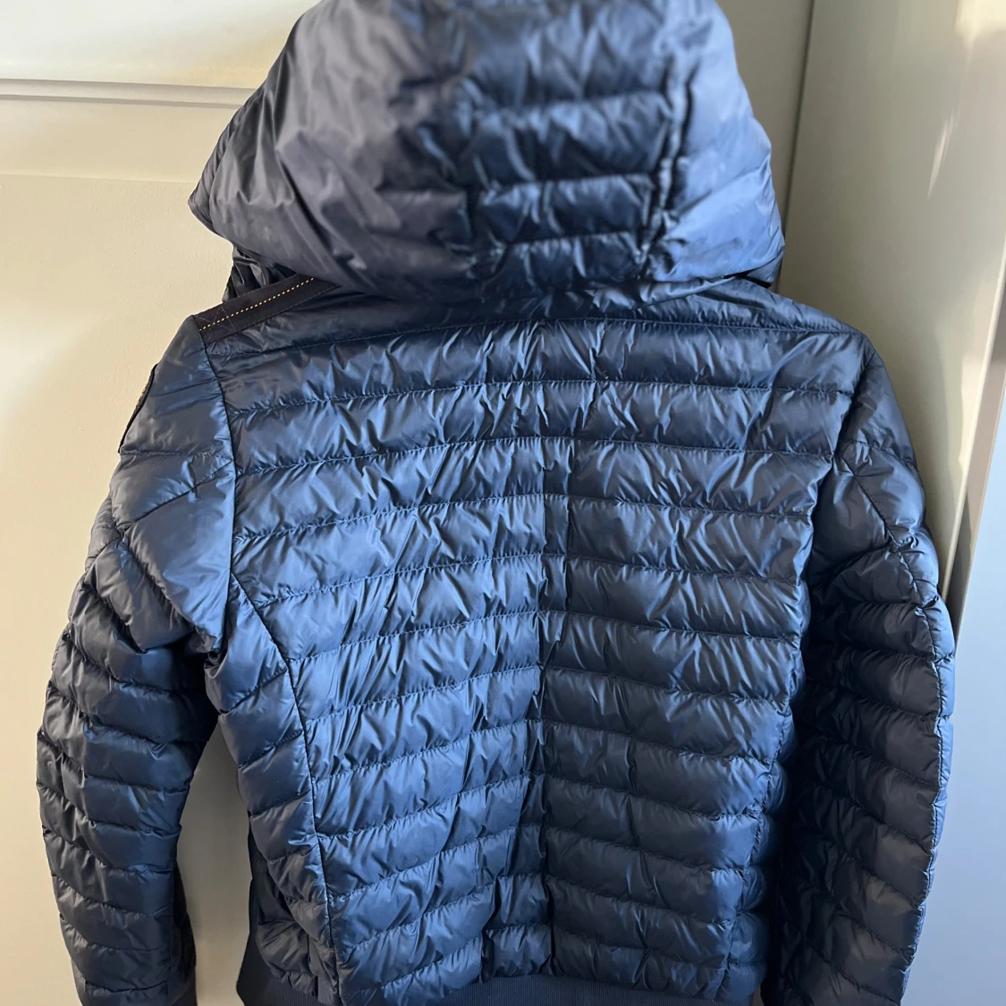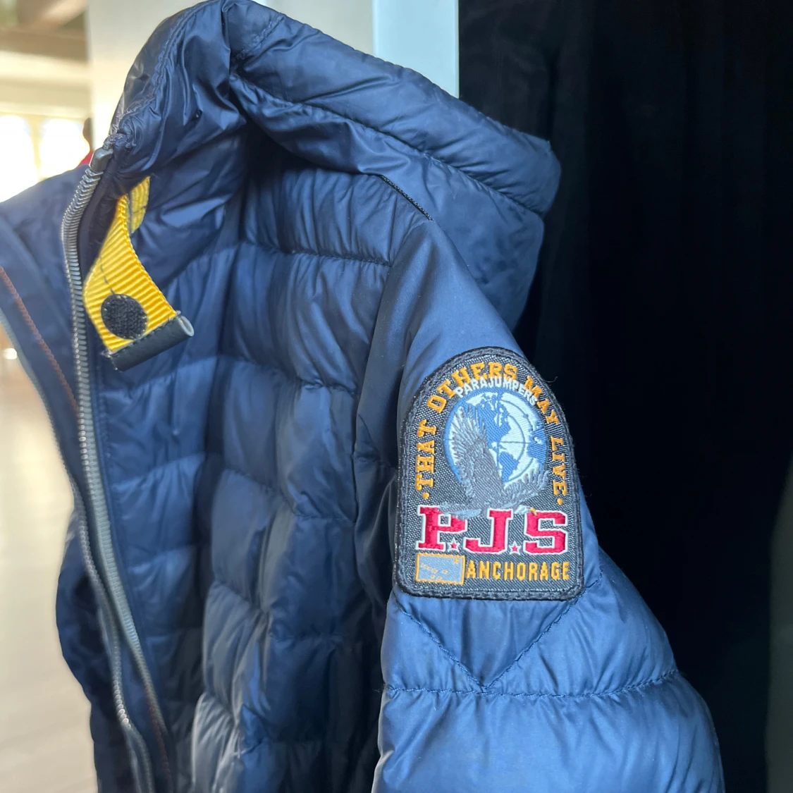 Snygg blå dunjacka från Parajumpers i modellen Hollywood. Jackan har huva, ribbade muddar och dragkedja framtill. Klassisk patch på ärmen och gul detalj vid halsen. Perfekt för kalla dagar och riktigt stilren look. Köpt på nk, pris kan diskuteras.