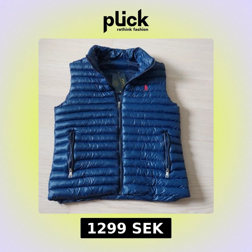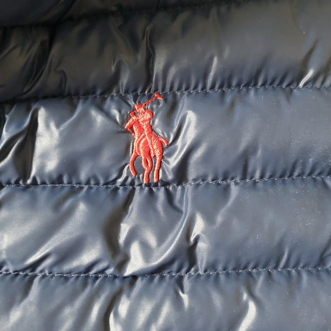 Snygg marinblå dunväst från Polo Ralph Lauren med horisontella quiltade sömmar och dragkedja framtill. Västen har två fickor med dragkedja och klassisk röd broderad logga på bröstet. Perfekt att slänga över en hoodie för en chill look.OBS! Har tyvärr tappat bort lappen.