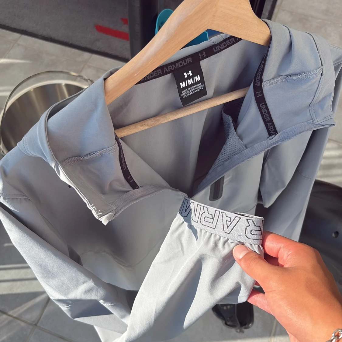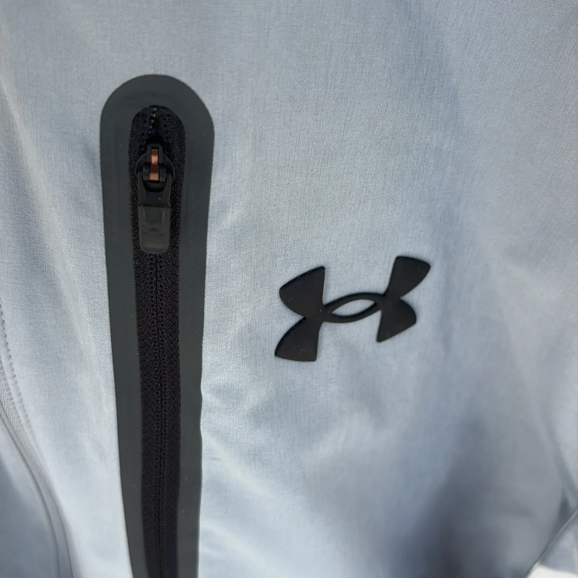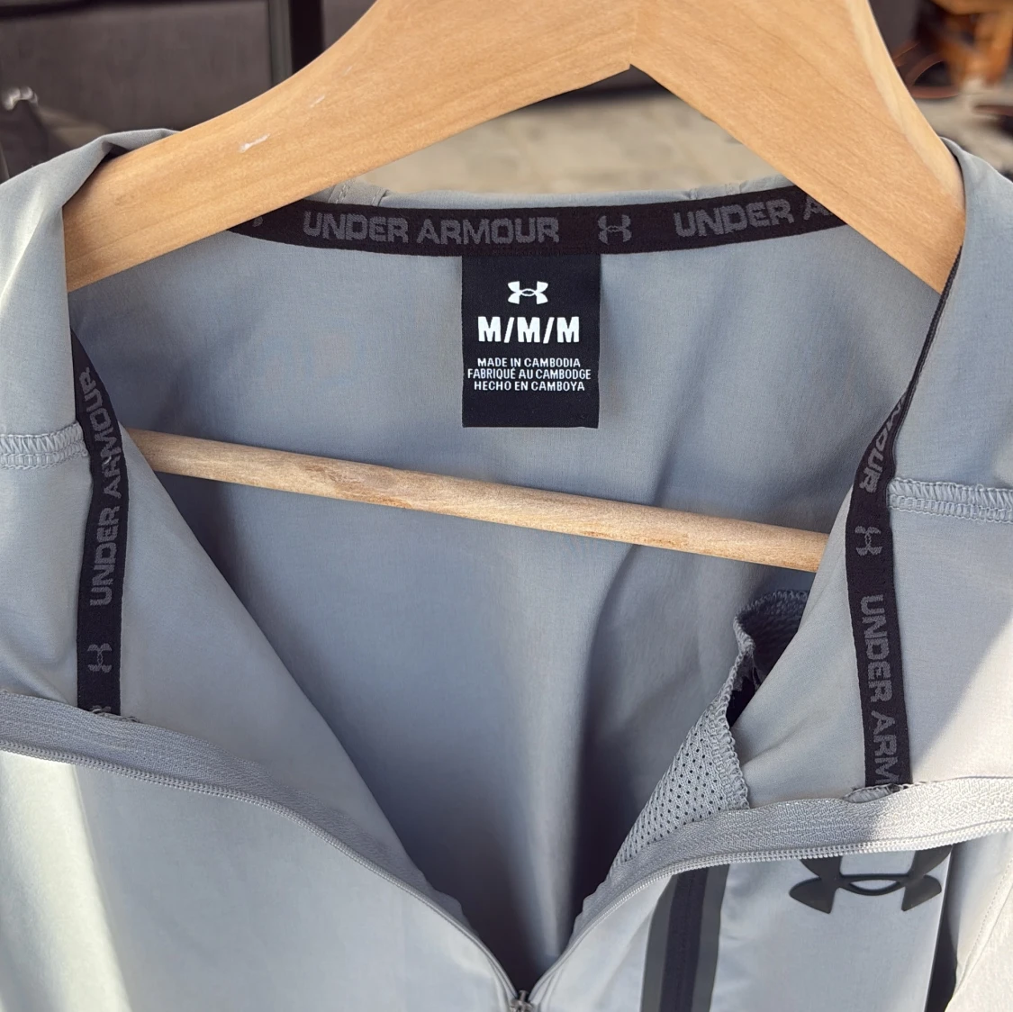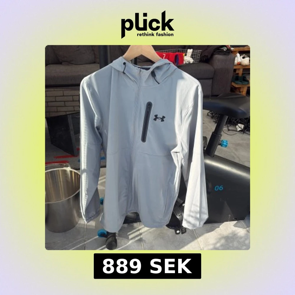 HELT NY OCH ÄKTA Snygg ljusgrå vindjacka från Under Armour med huva och svart logga på bröstet. Jackan har en bröstficka med dragkedja och är tillverkad i ett lätt syntetmaterial. Perfekt för träning utomhus eller när du vill ha en sportig look. Fick den som present men den va för stor så det är därför jag säljer den
