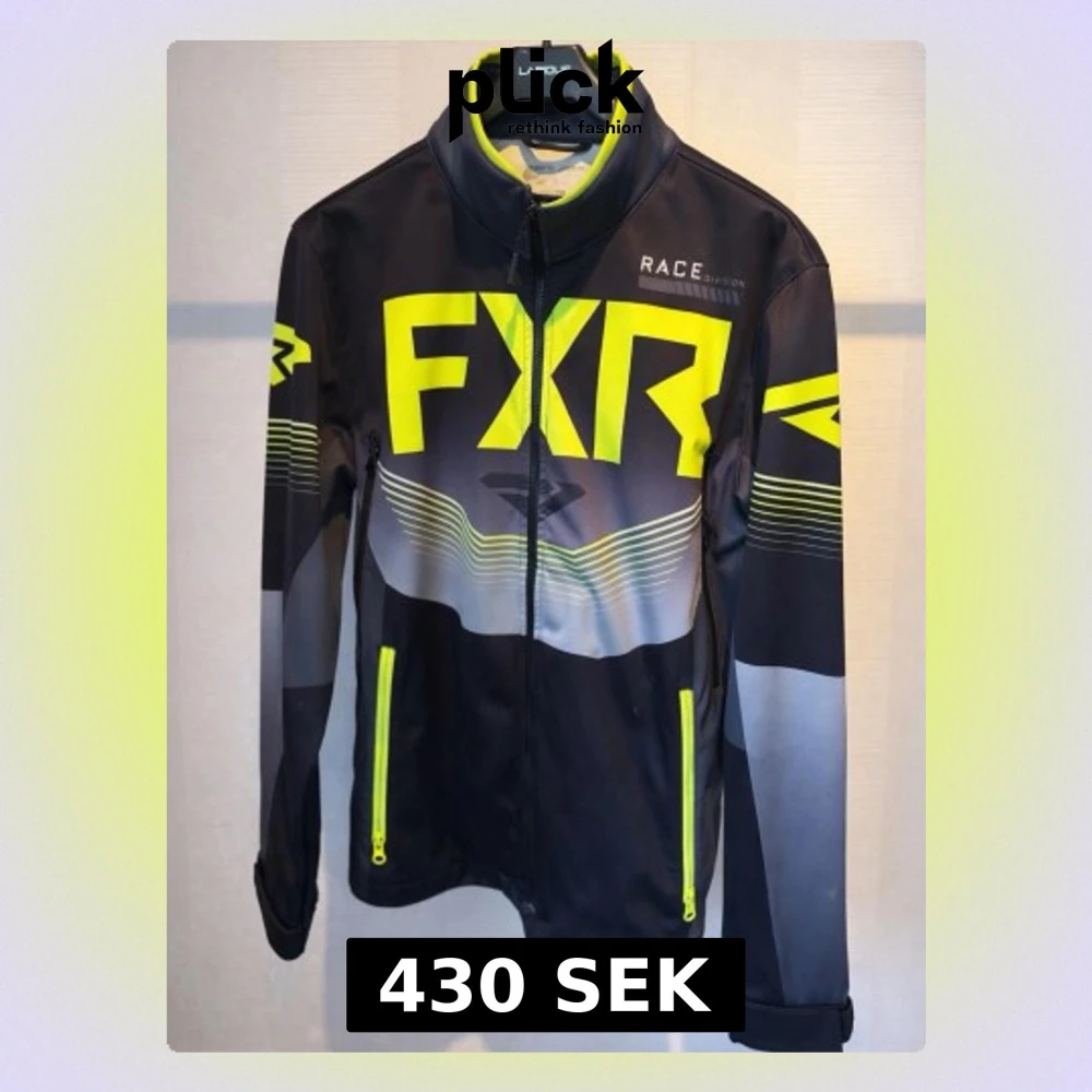 Snygg vindjacka från FXR med coolt neon-gult tryck och grafiska detaljer. Storleken är XS men utan cross utrusning på är det som M. Väldigt bra kvalitet och en fin jacka