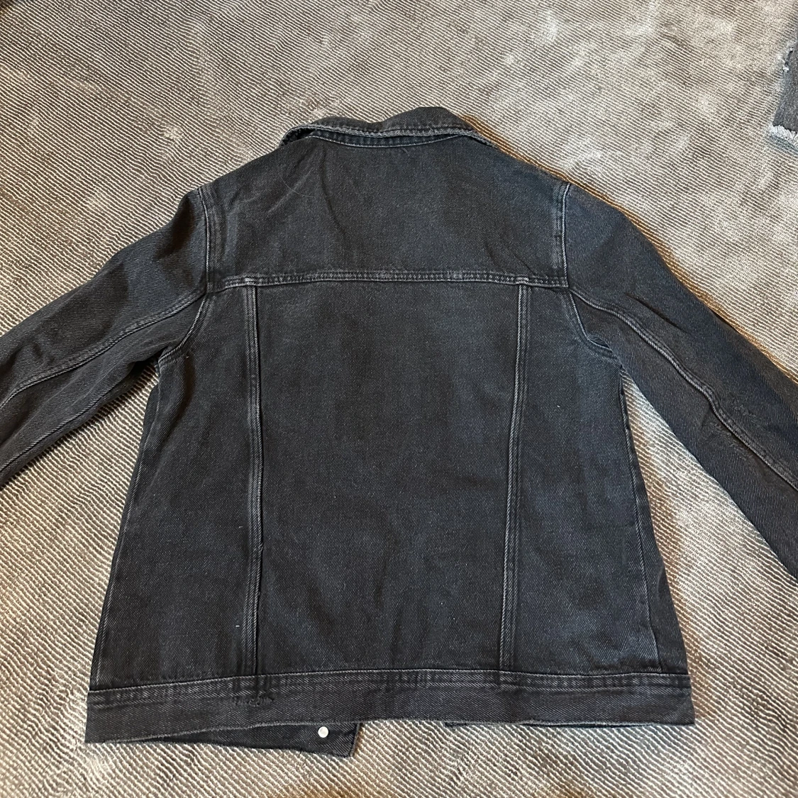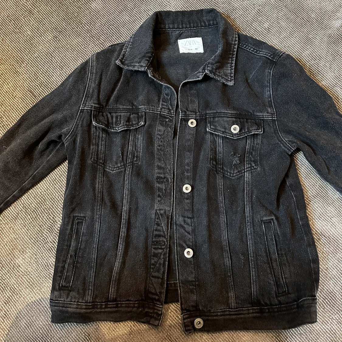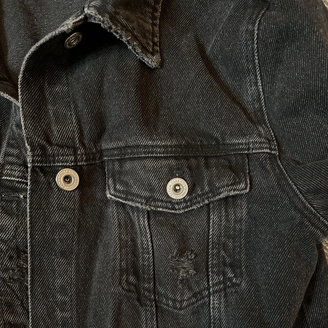 Jättesnygg gråsvart jeansjacka med slitningar. Passar till allt och är mycket användbar. Köpt på zara för ca 400 kr på barnavdelningen men är relativt stor i storleken❤️❤️