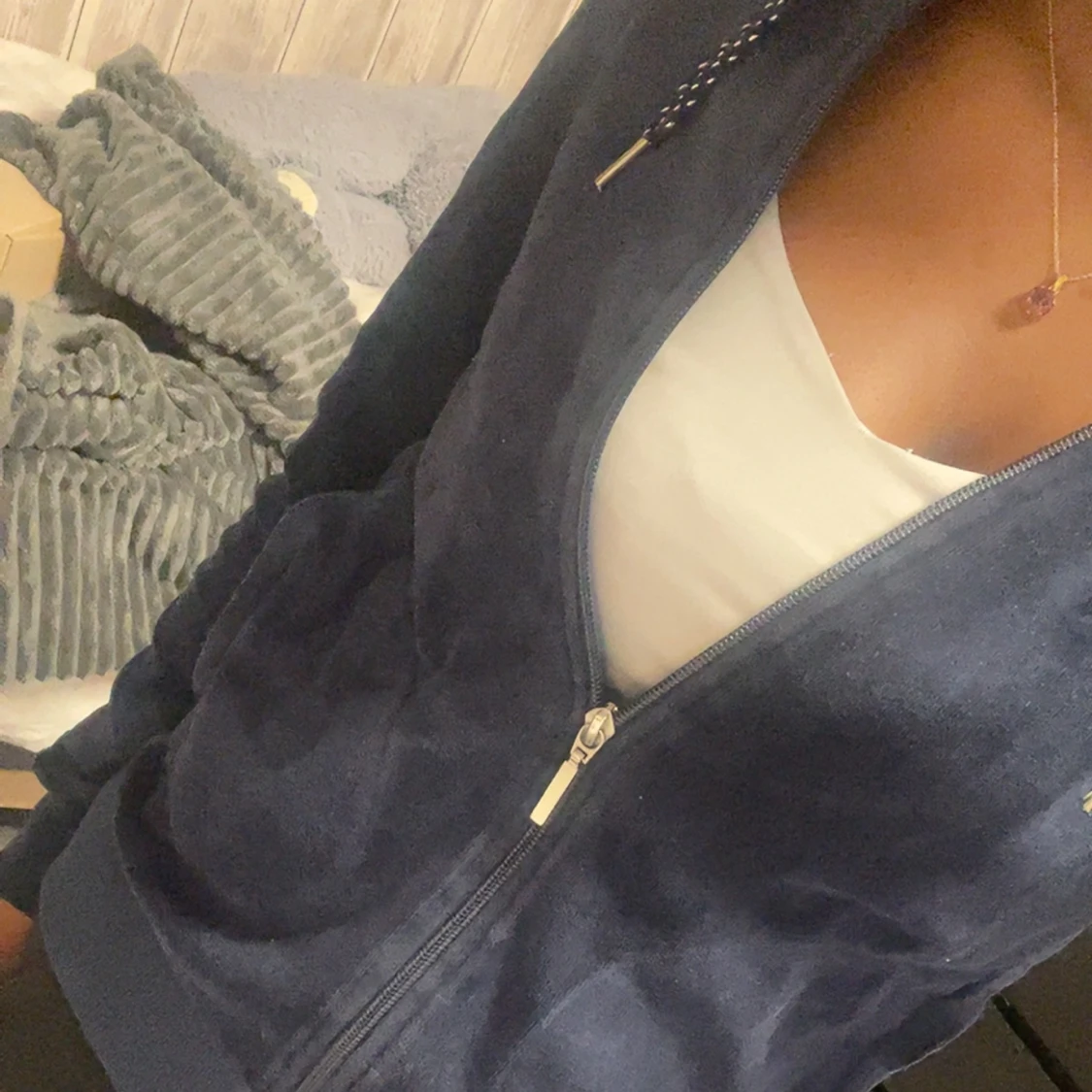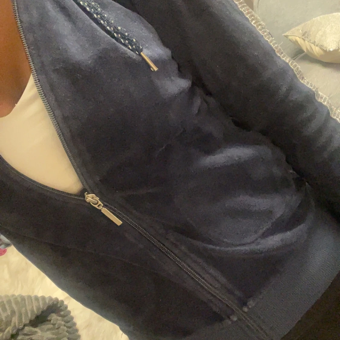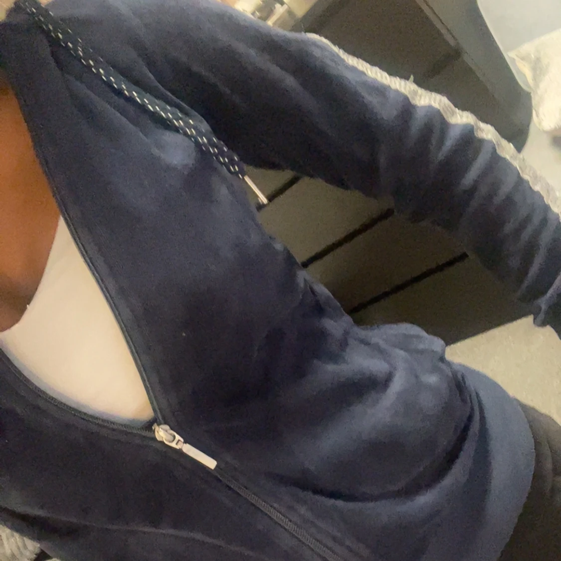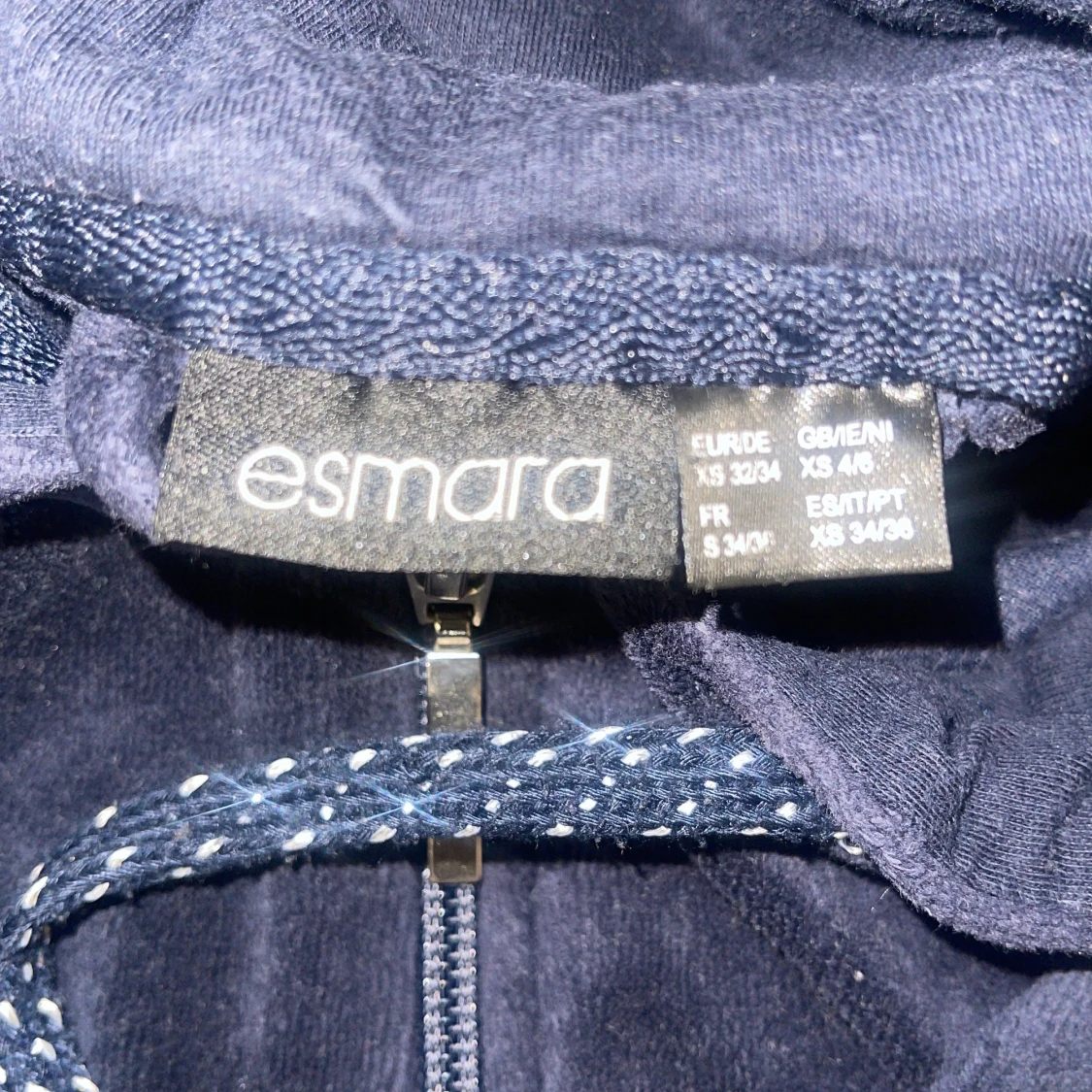 Mysig mörkblå hoodie från Esmara med dragkedja framtill och huva med snören. Jackan har långa ärmar och ribbade muddar. Perfekt för en avslappnad stil och enkel att matcha med andra plagg.