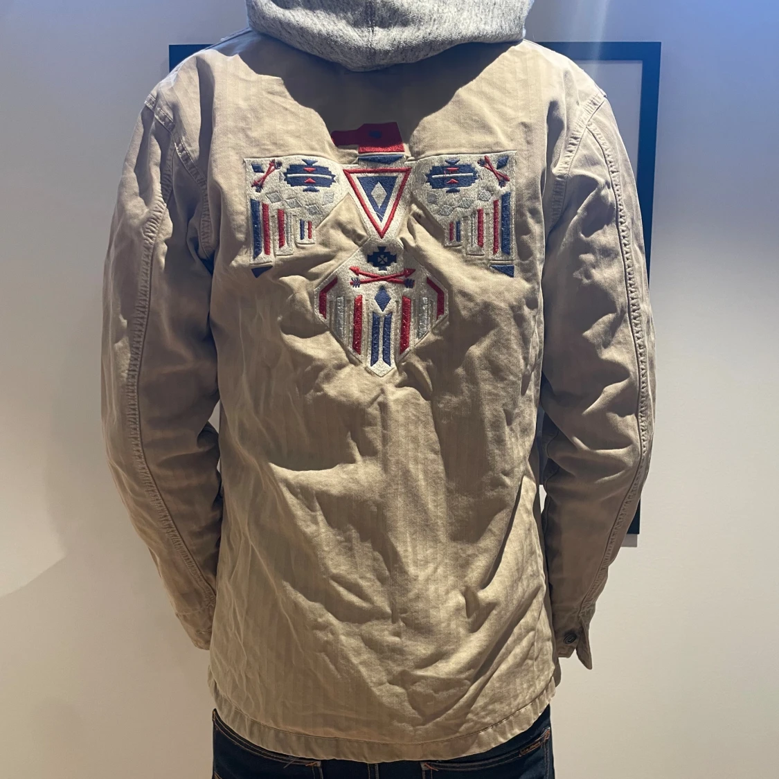 Säljer en beige overshirt med snyggt broderat på ryggen och framifrån. Hör av er vid minsta fråga eller fundering!😁