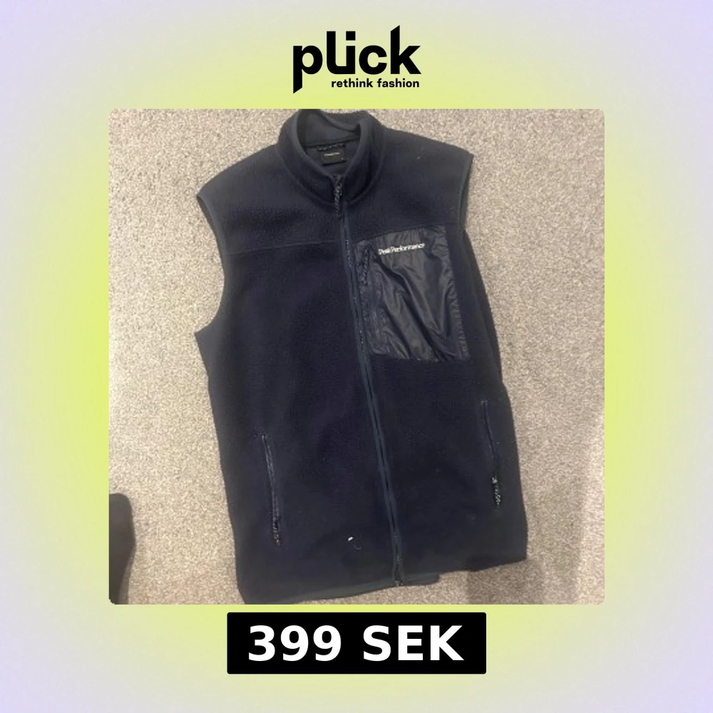 Säljer en mörkblå fleeceväst från Peak Performance med dragkedja och en praktisk bröstficka. Perfekt för lager-på-lager under kyliga dagar. Västen har en stilren design och är lätt att matcha med andra plagg.