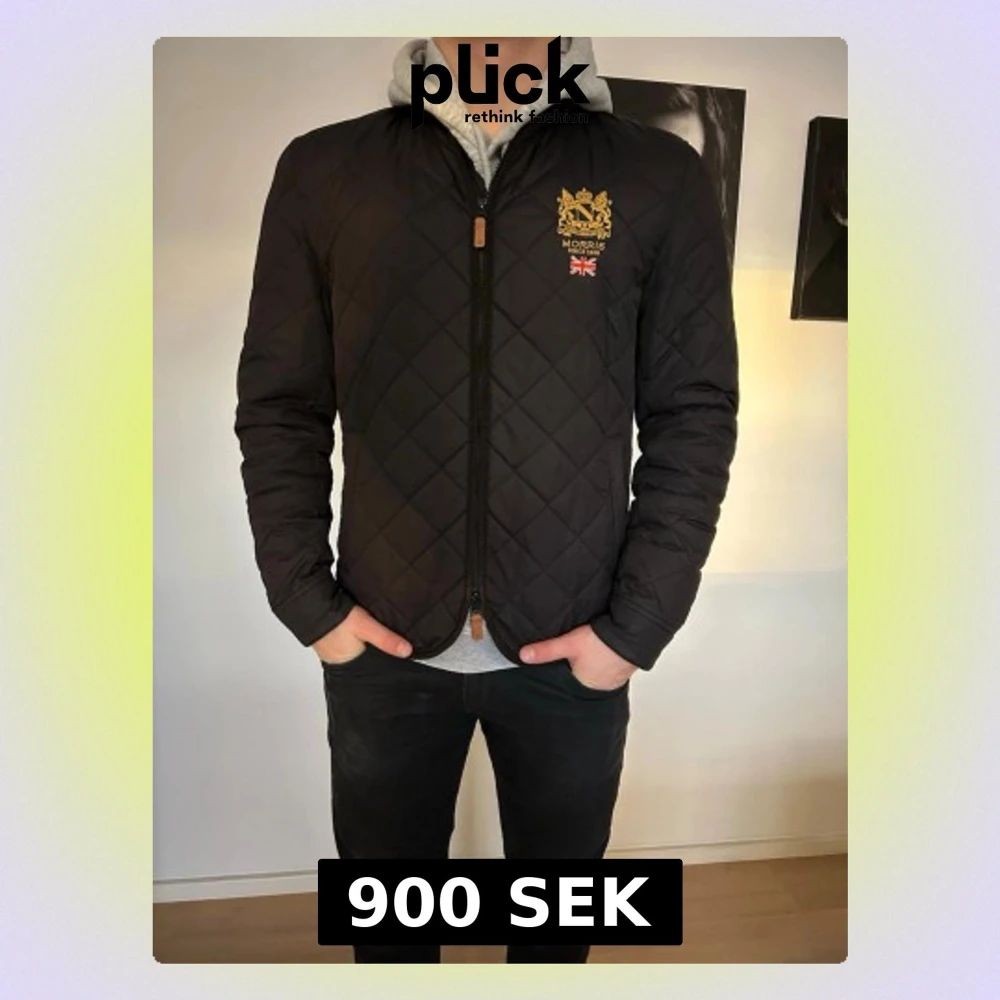 Snygg svart jacka med bruna detaljer från Morris i storlek medium. Jackan är i ett grymt sparsamt använt skick utan defekter.