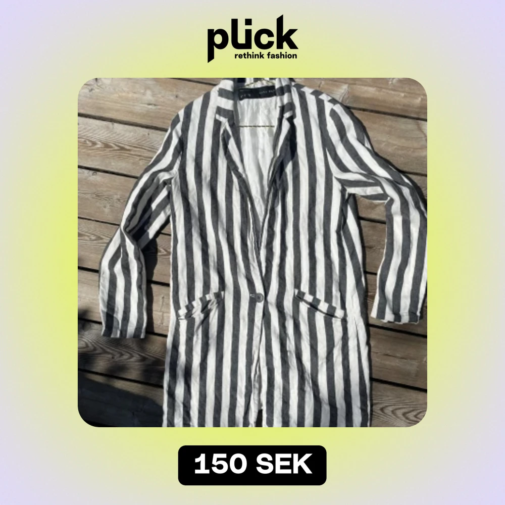 Längre kavaj från Zara storlek M Materiallapp klippt men gissar bomull/linne på utsidan, annat foder. Lätt gulnat i armhålor men går säkert att få bort, la den i solen en stund efter fotot och blev märkbart blekare. Någon grå nyans och vit Sommar