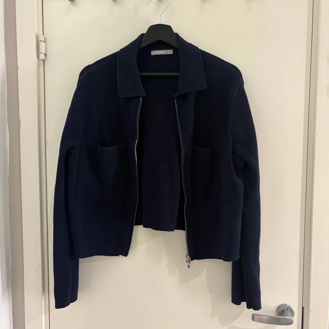 Snygg mörkblå cardigan från åhlens med dragkedja framtill och två stora fickor. Jackan har en klassisk krage och långa ärmar, perfekt för en stilren look.