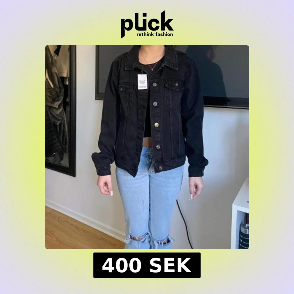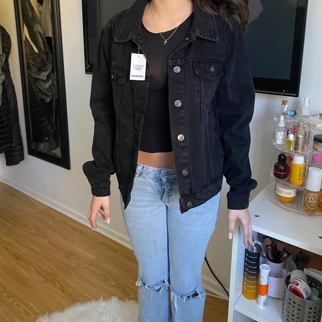 Svart jeansjacka från Boohoo med klassisk krage, raka axlar och knappar framtill. Jackan har två bröstfickor med lock och långa ärmar med knapp vid mudden. Snygg loose passform som funkar till många olika stilar. Aldrig använd, pris kan diskuteras