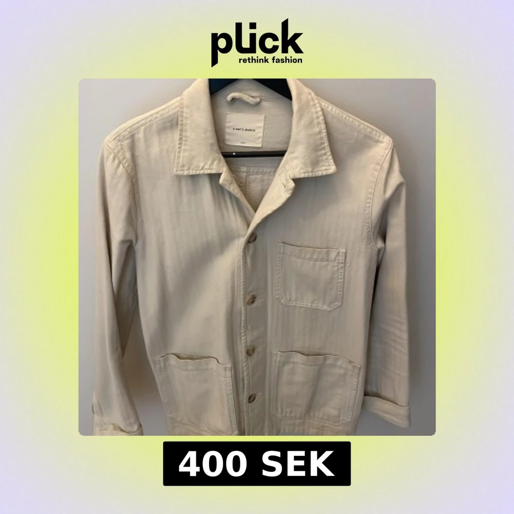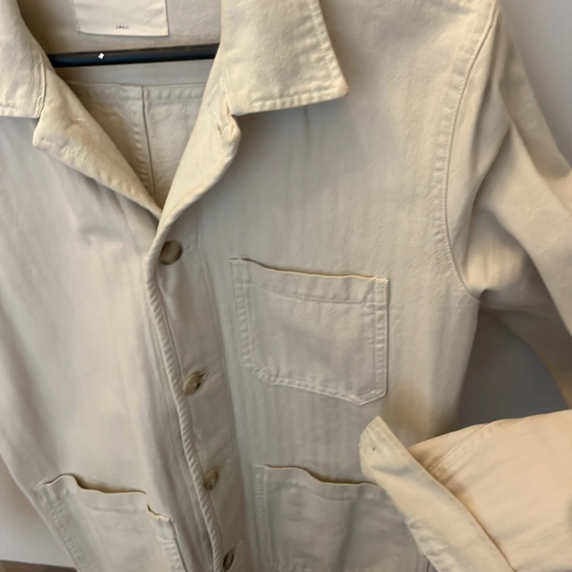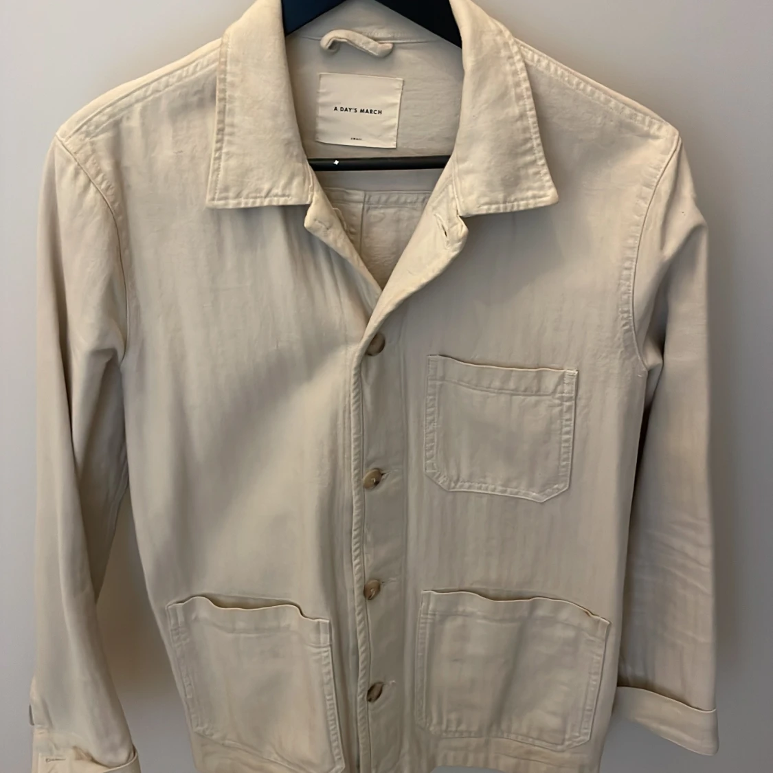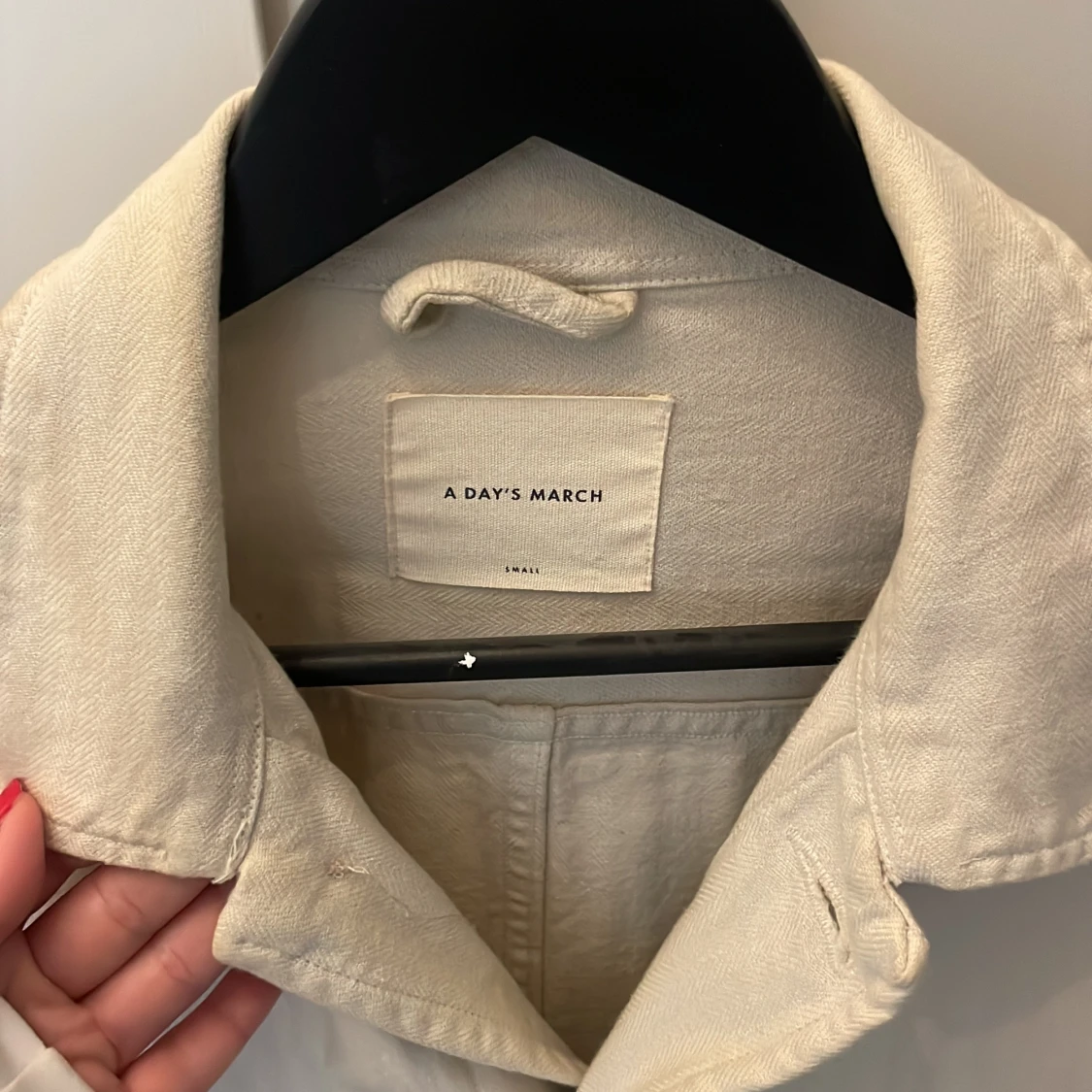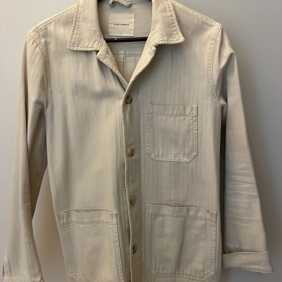 Stilren beige vårjacka från A Day's March med klassisk krage och tre utanpåfickor framtill. Jackan har knäppning med knappar.