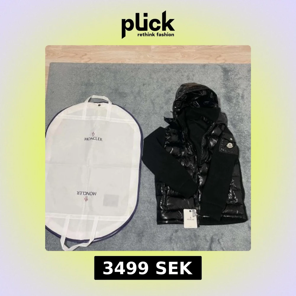 Säljer en svart glansig dunväst från Moncler med stickade svarta ärmar och huva. Västen har dragkedja framtill, Moncler-logga på bröstet och medföljande skyddspåse. Perfekt för lager-på-lager och streetstyle.