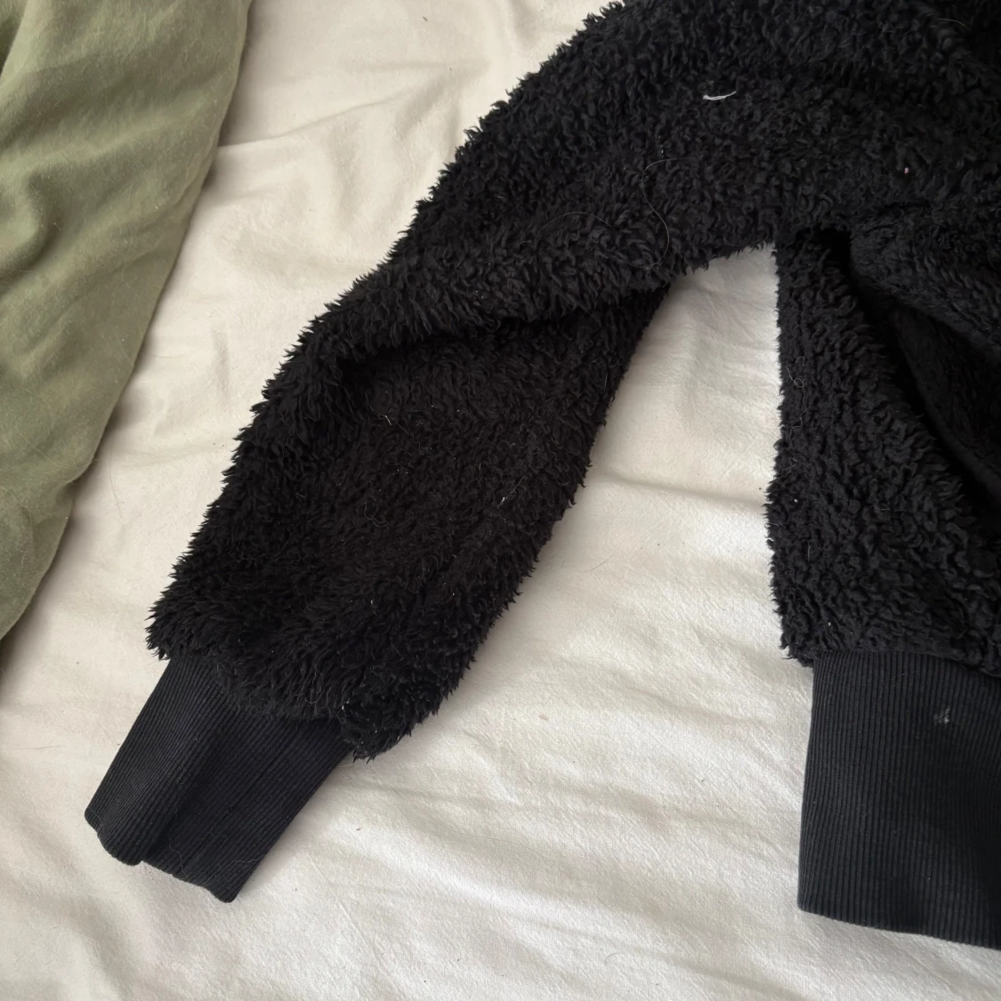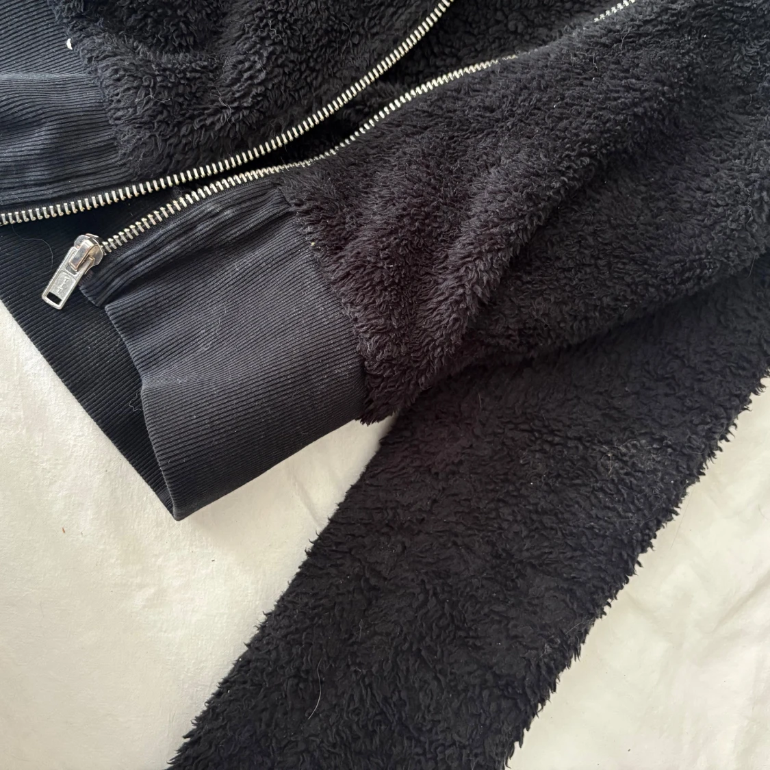 Svart kort teddy jacka i storlek XS från Gina tricot. Använd men i gott skick, det vita på jackan är bara ludd och lite djurhår och jackan klädrullas såklart innan den skickas! 🩵Supersöt nu till hösten !