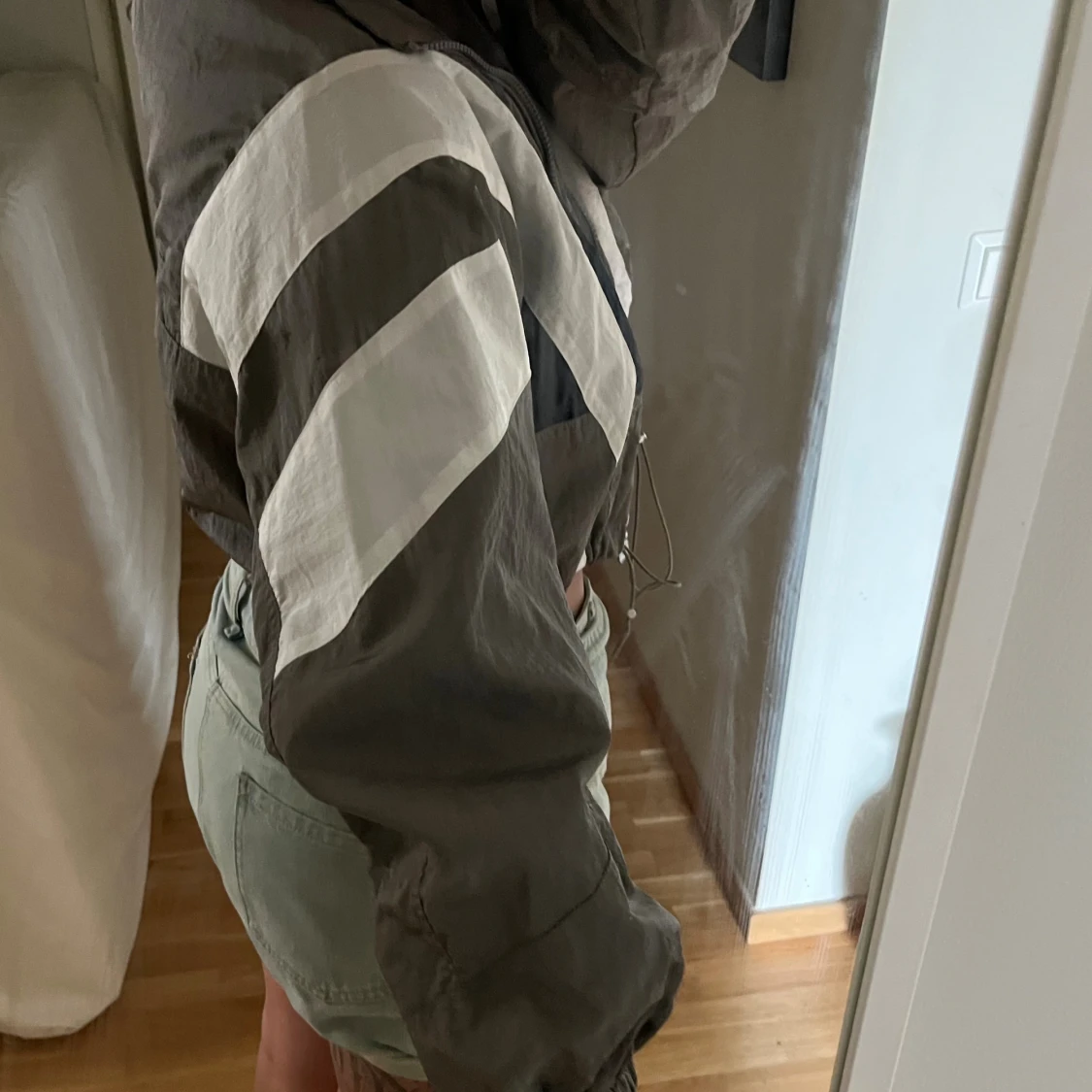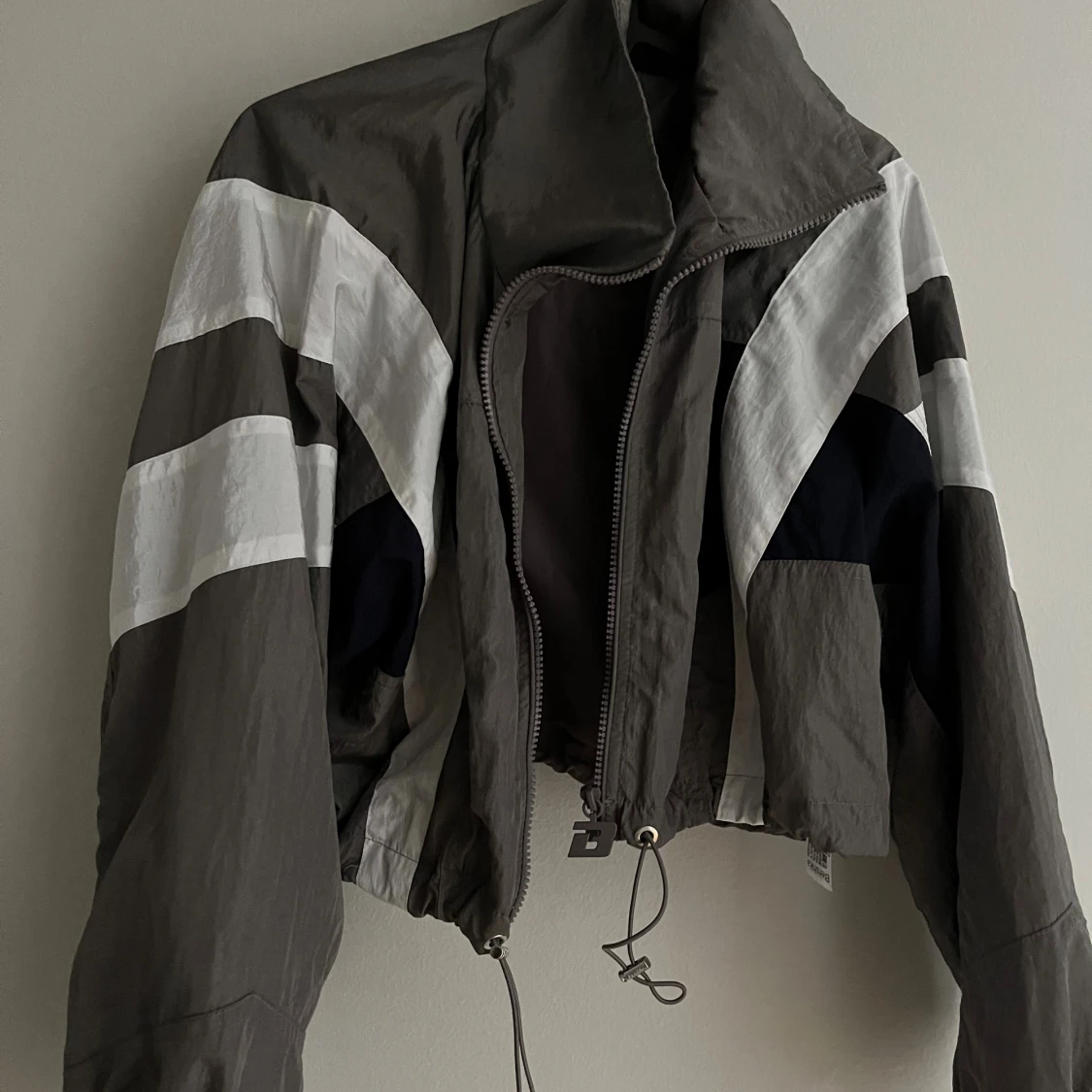 Säljer en grå och vit vindjacka från Bershka i storlek M. har dragkedja framtill och har inslag av reflexer. Perfekt för hösten! (Läs alltid min profil för villkor)