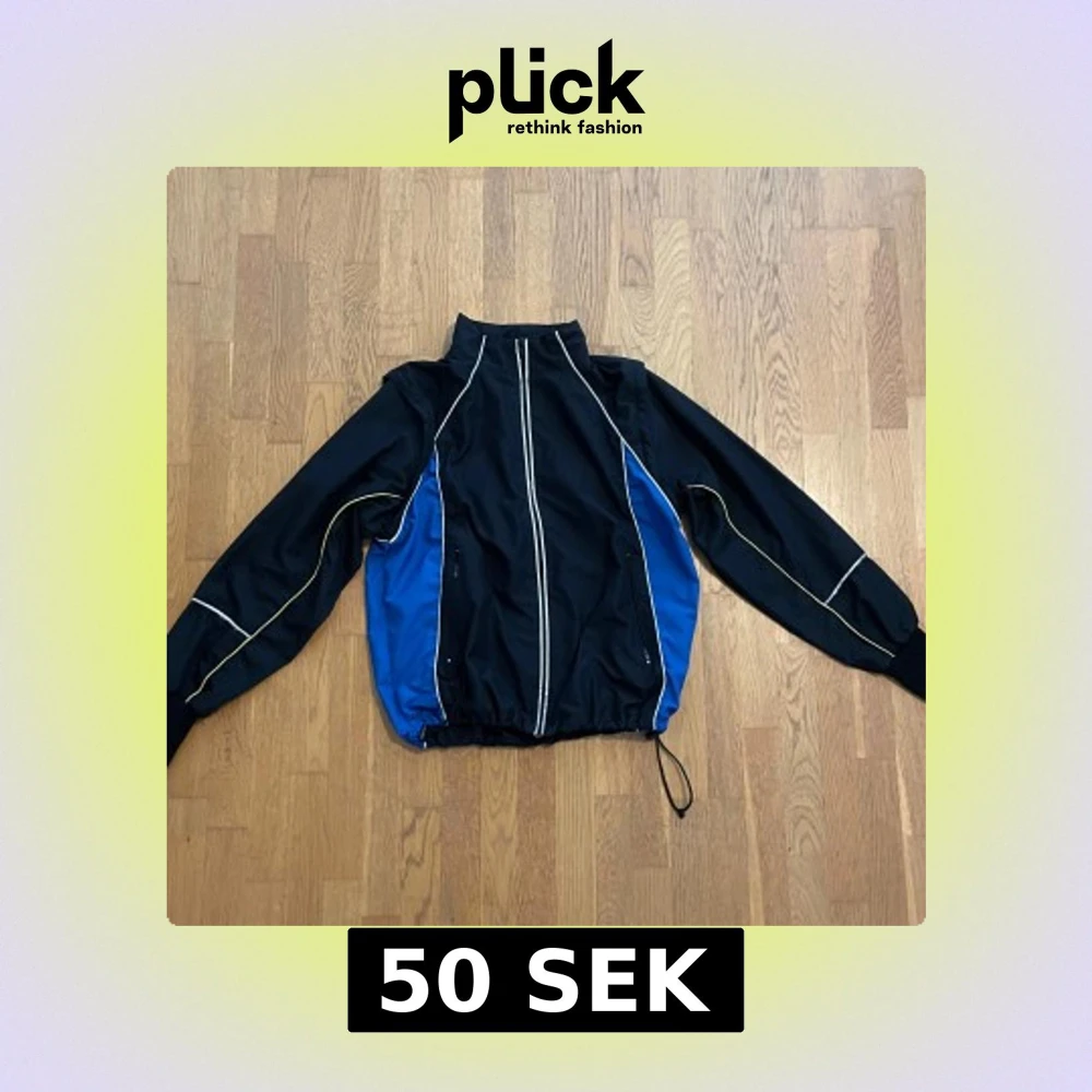 Sportig vindjacka från i svart och blått med vita och gula detaljer längs ärmar och fram. Jackan har hög krage, dragkedja framtill, snörning i midjan och två fickor med dragkedja. Avtagbara armar