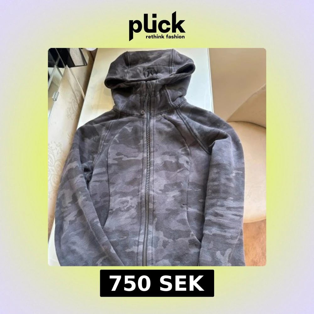 Säljer en grå hoodie med camouflagemönster från Lululemon. Jackan har dragkedja framtill, huva och en sportig look