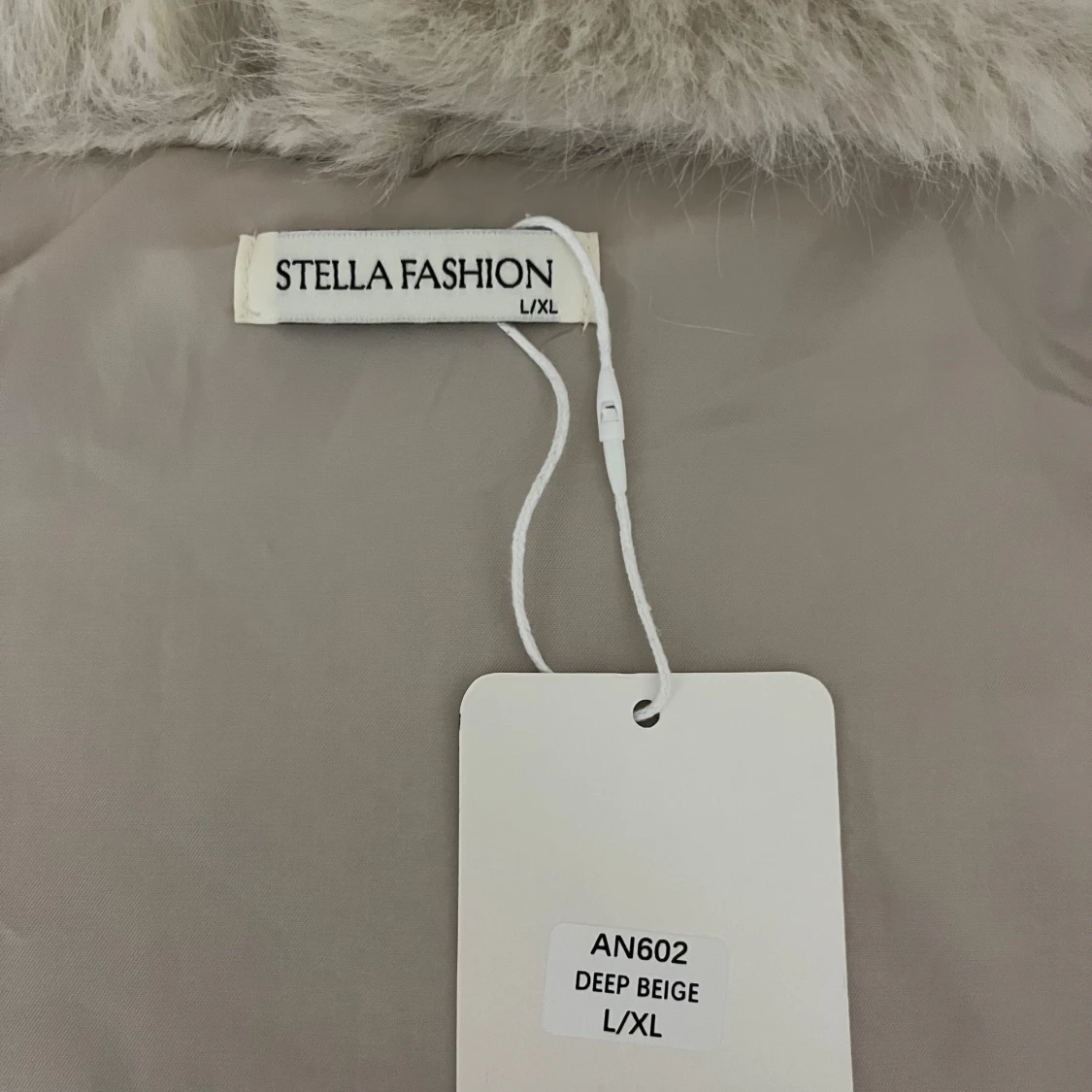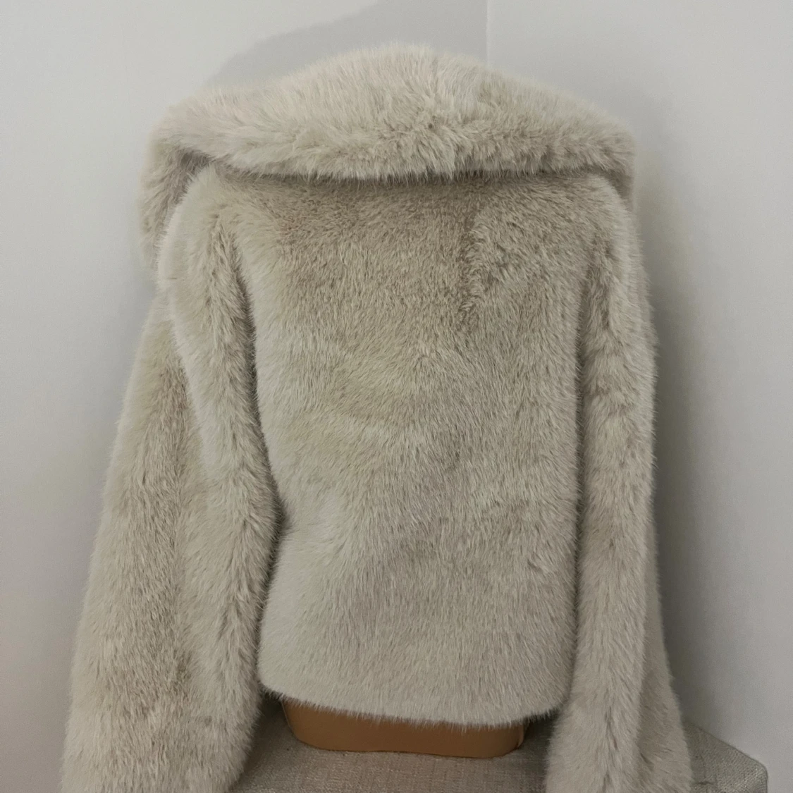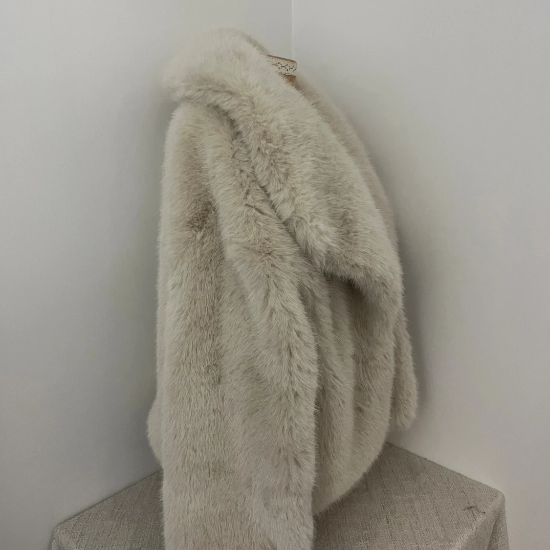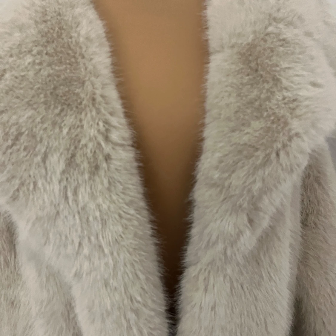 Säljer en fluffig och lyxig beige pälsjacka med bred krage och långärmad design. Jackan har en oversized look och är tillverkad i mjukt pälsmaterial som ger en riktigt cozy vibe. Perfekt för dig som vill sticka ut med en statement piece i vinter.