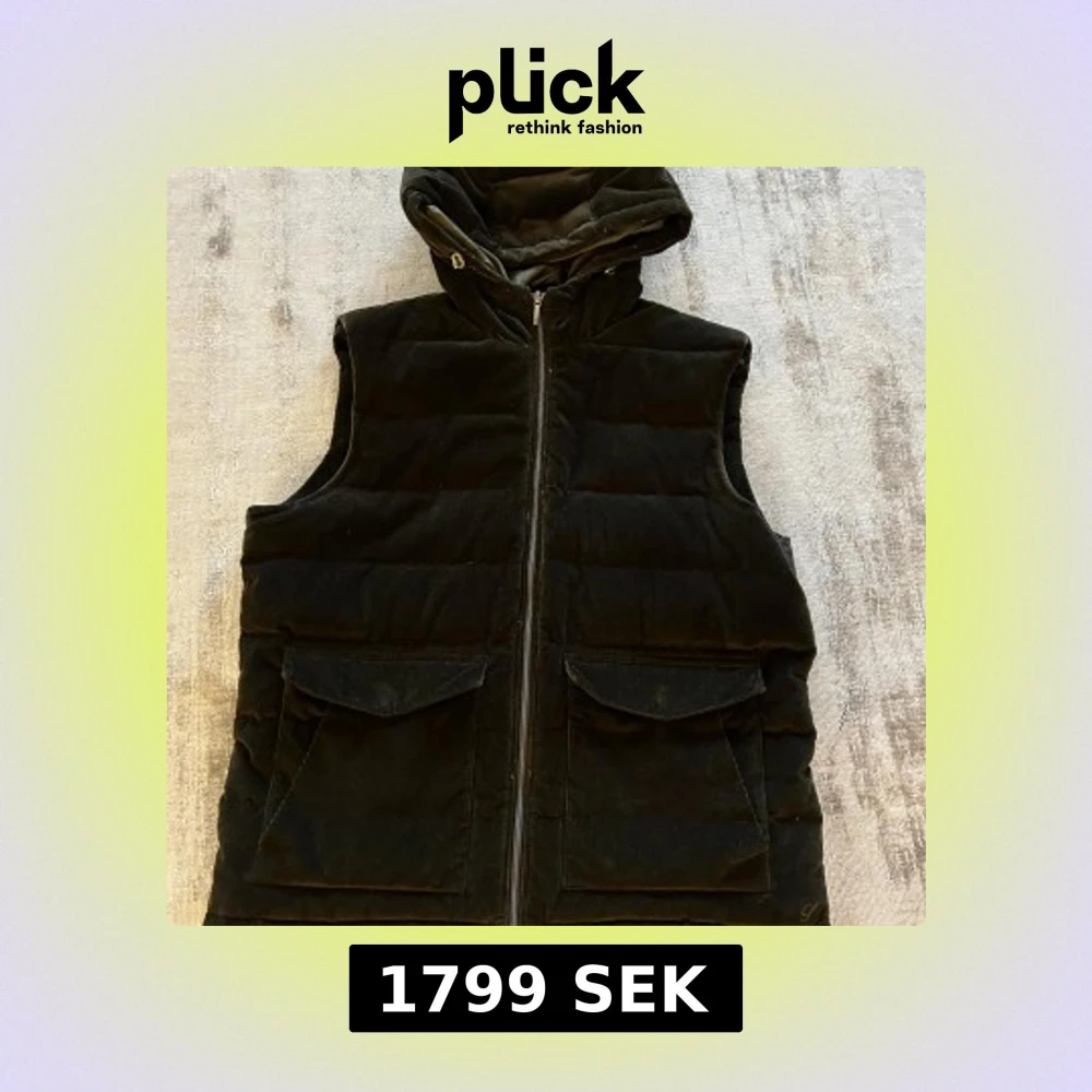 Säljer en svart dunväst från Stenströms i manchestertyg. Västen har huva, dragkedja framtill och två stora fickor med lock. Nypris ca 4000